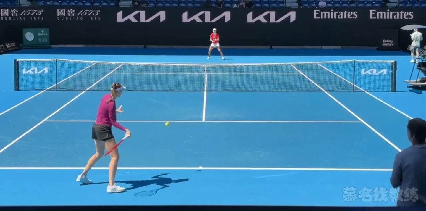 这是一段莱巴金娜跟拉杜卡努在墨尔本公园对练的视频片段,从莱巴金娜的视角,包含底线、接发和发球,视频里没有透露任何球员信息,来看看 AI 教练幕大师是怎么盲评的。