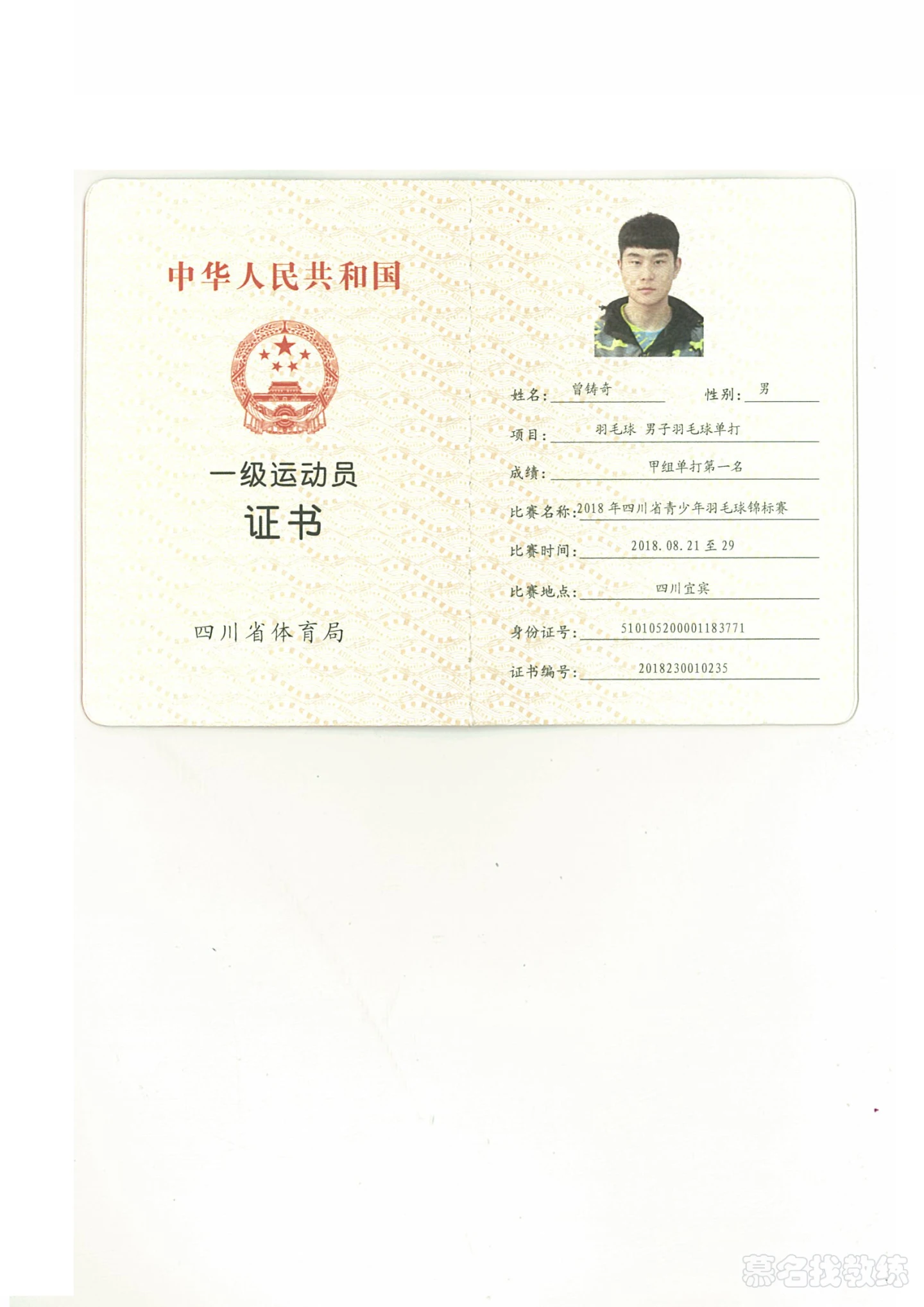 2018四川省青少年羽毛球锦标赛男子单打甲组第一名