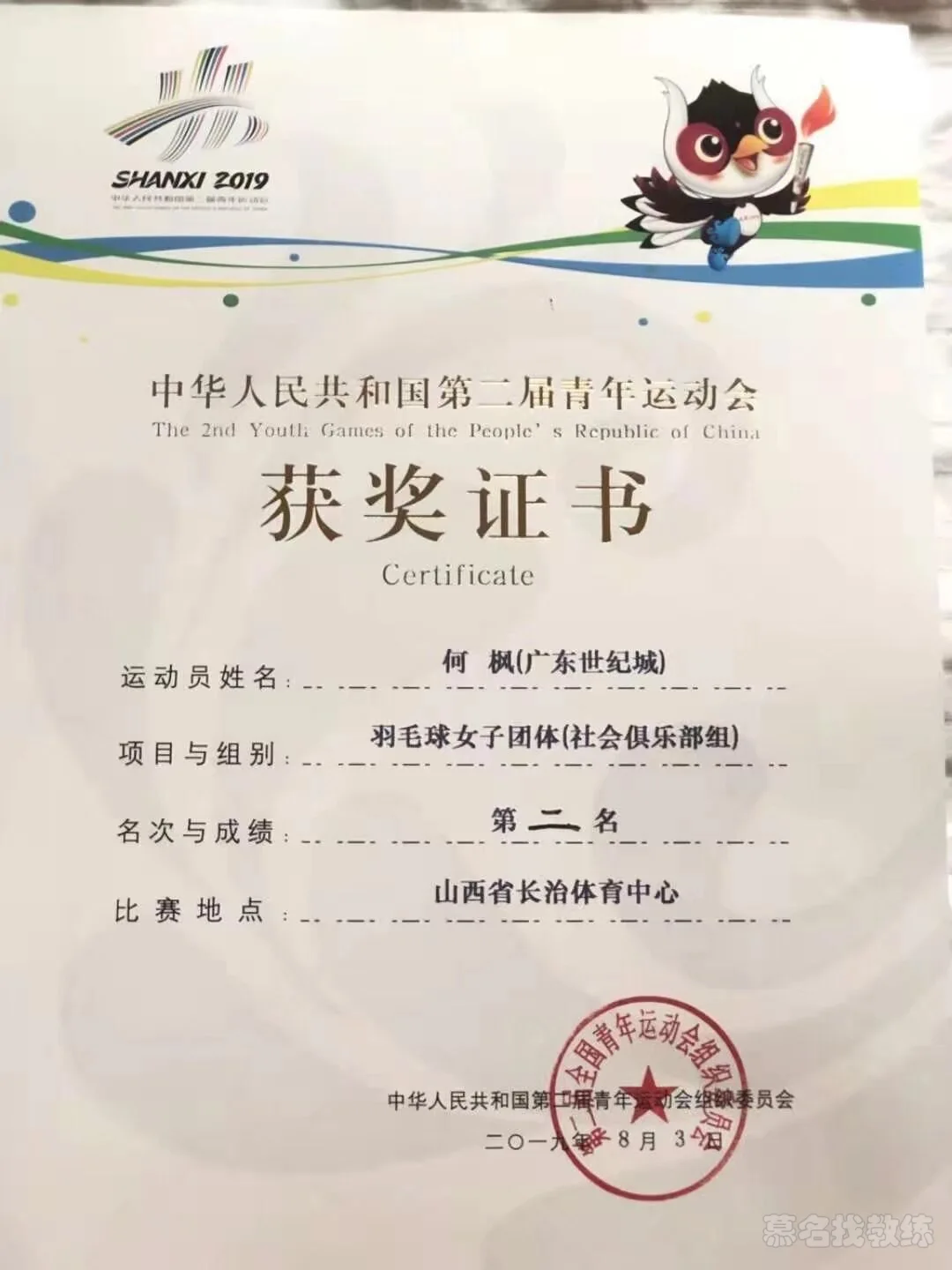 4.中华人民共和国第二届青年运动会羽毛球女子团体第二名