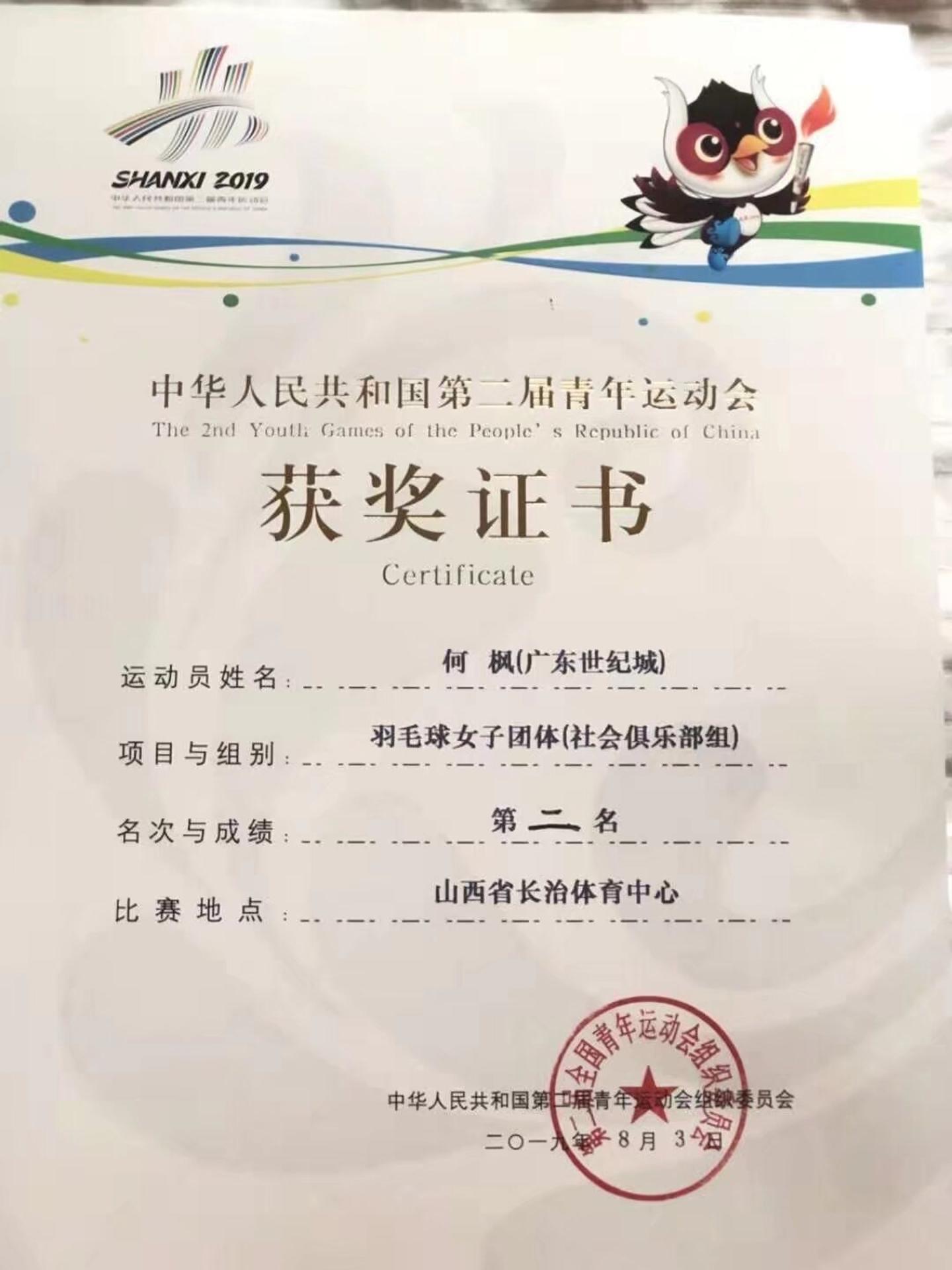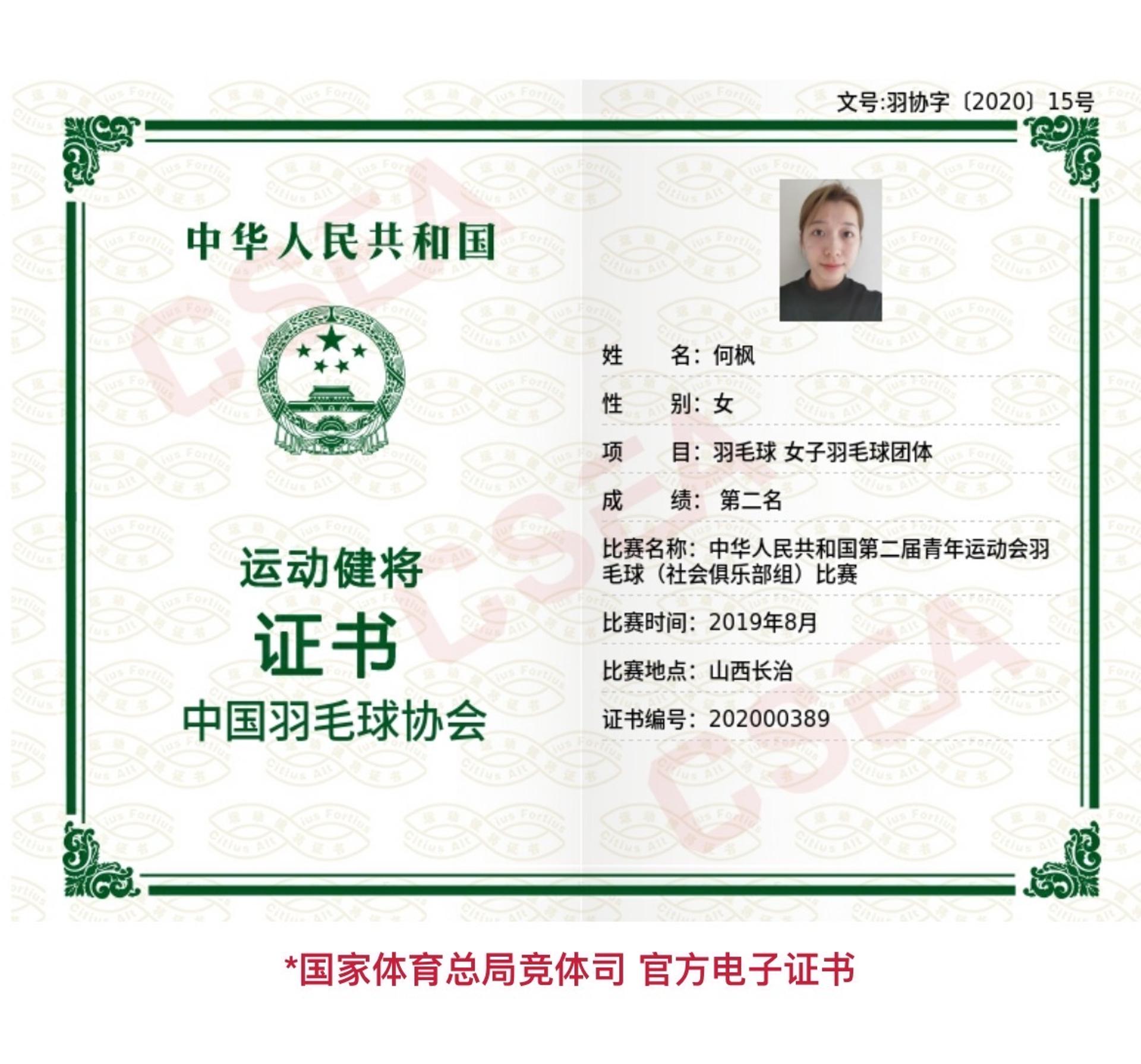 1.2018年yonex全国u16-18羽毛球比赛总决赛第三名 2.2018全国u16-18羽毛球总决赛女子双打第一、女单第二 3.2019年尤尼克斯全国u17-18羽毛球比赛女双第一、团体第三 4.中华人民共和国第二届青年运动会羽毛球女子团体第二名 5.广东省粤港澳大湾区邀请赛团体第三名 6.2024年尤尼克斯美舞之志女双公开组第二名 7.2024年威克多窈窕淑女女双公开组第二名 8.2024年威克多双雄会双打混合团体邀请赛公开组第二名(广州站) 9.2024年威克多双雄会双打混合团体邀请赛公开组第二名(深圳站) 10.2024年桂城街道第二届李宁众行女子羽毛球公开赛女双、混双冠军 中华人民共和国第二届青年运动会羽毛球女子团体第二 体适能执教资格证书