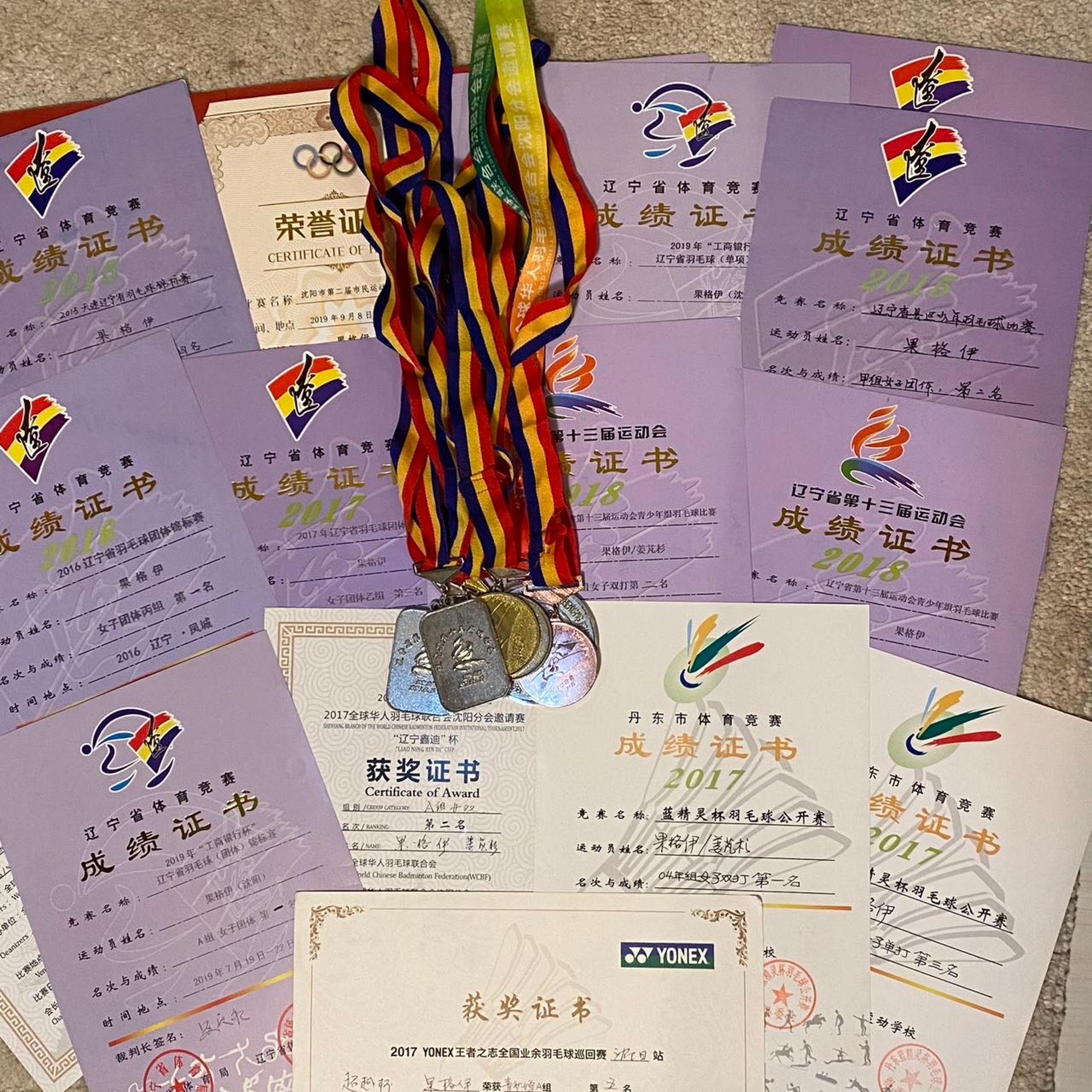第十三届辽宁省运会女子双打亚军 女子团体冠军 2016年辽宁省锦标赛丙组女子团体冠军 2017全球华人羽毛球邀请赛女子双打亚军 2017蓝精灵羽毛球公开赛女子双打冠军 2021年中国中学生羽毛球锦标赛混合双打第五 女子团体第一名 2022年第十五届中国中学生羽毛球锦标赛女子双打第六名 2024年广东省大学生运动会羽毛球丙组女子单打第三名 第十三届辽宁省运动会女子双打亚军