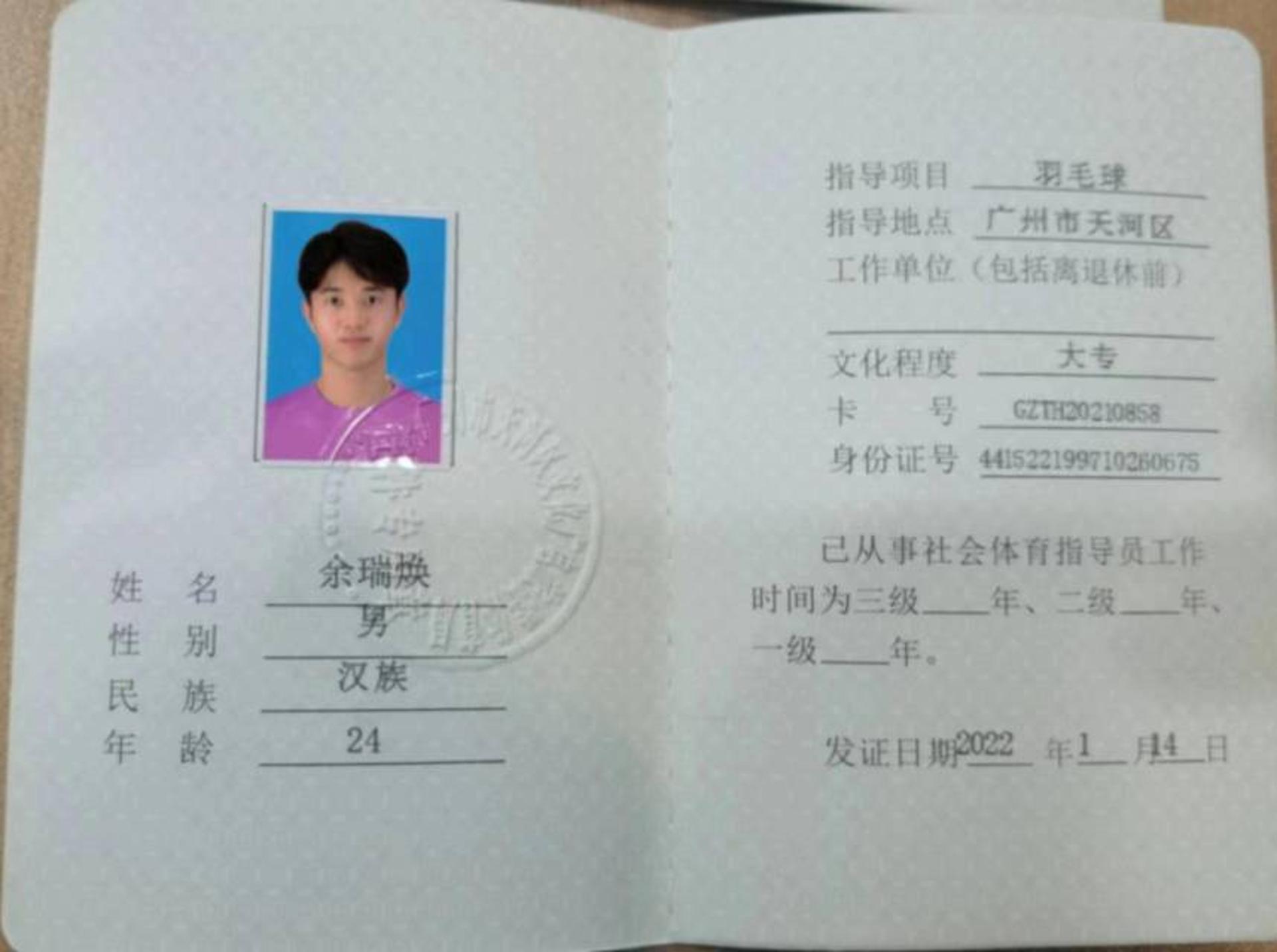 余瑞焕——广州羽毛球教练