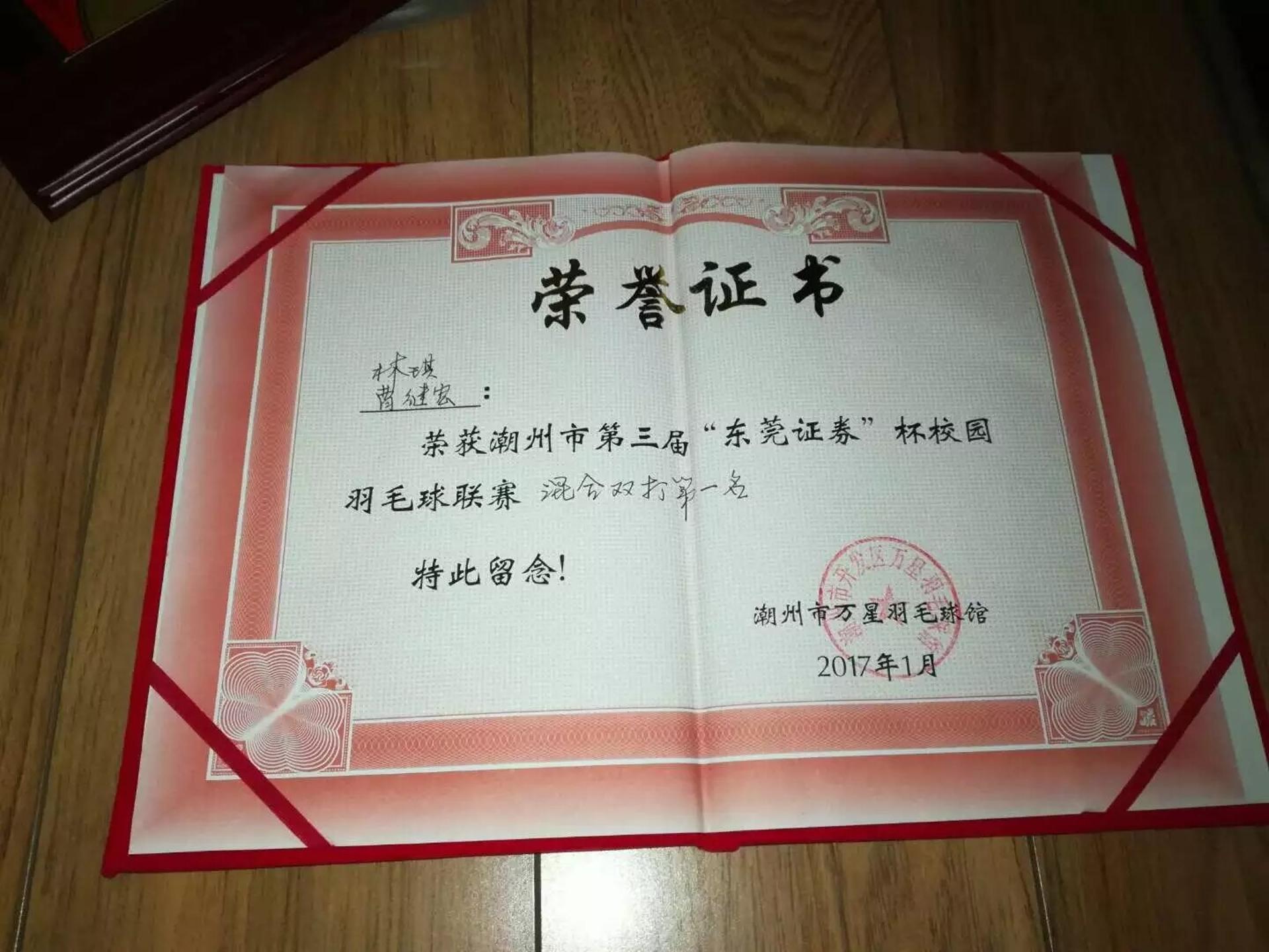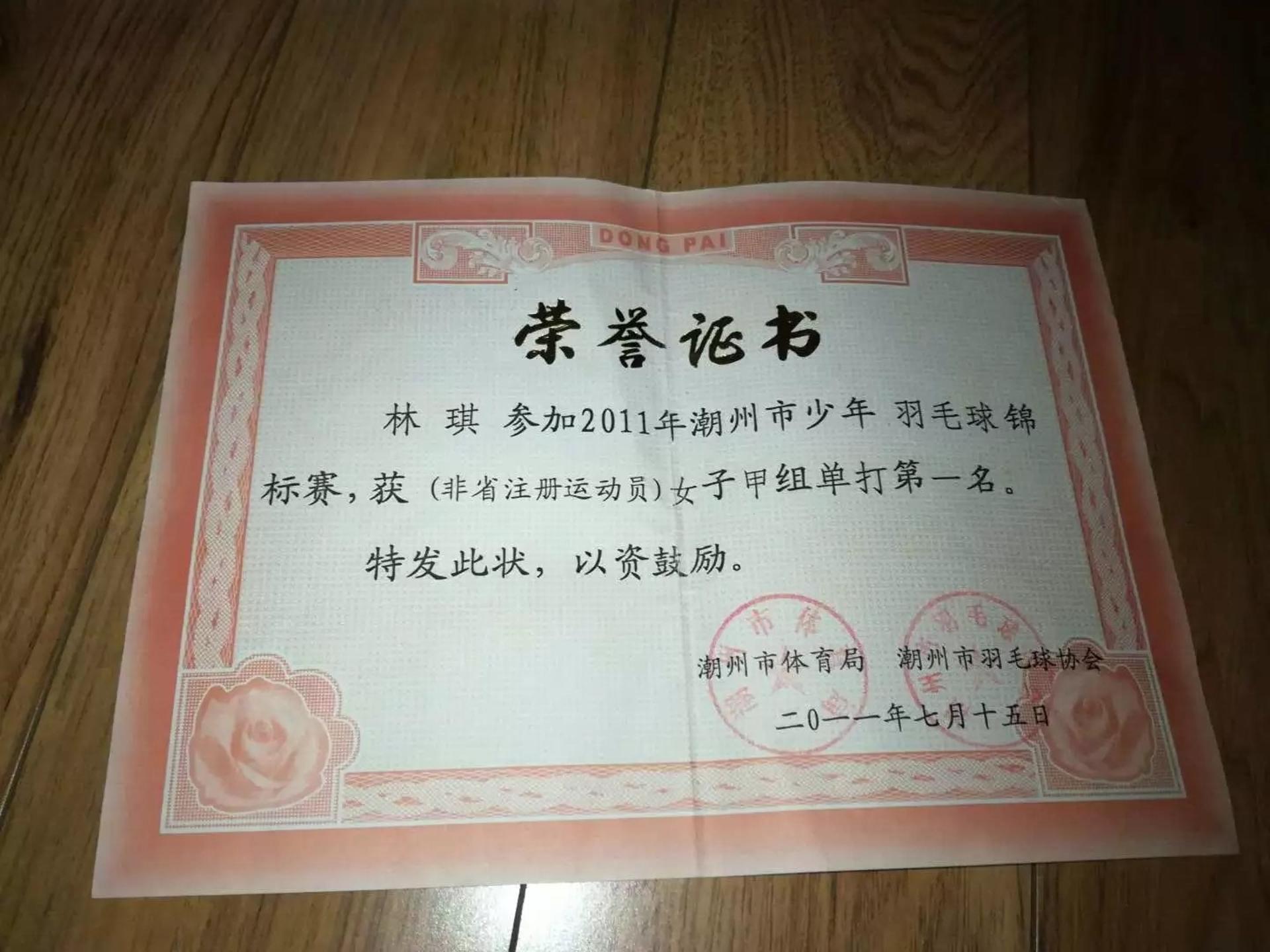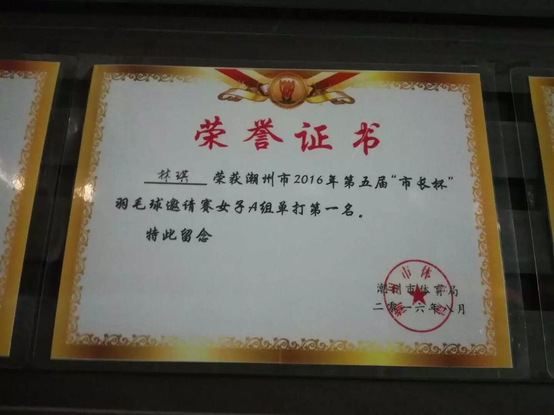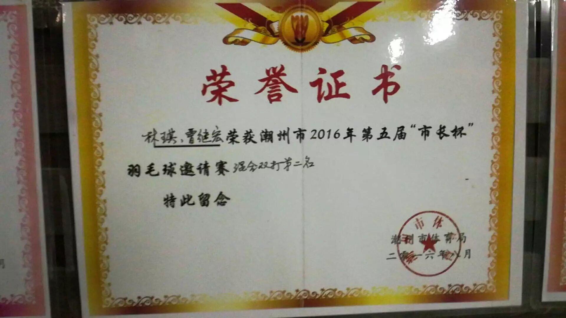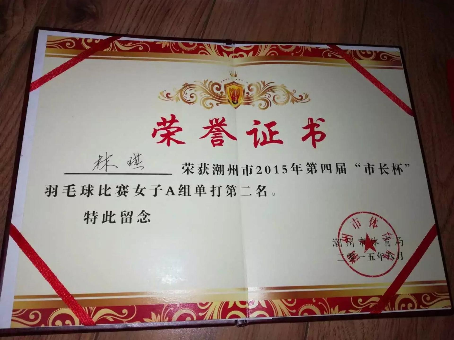 1. 潮州市第一届青少年羽毛球锦标赛女子单打冠军 2.潮州市第15、16届市长杯女子单打冠军 3.潮州市盐典杯混双冠军 潮州市锦标赛女子单打第一名 潮州市第四届“市长杯”女子单打第二名 潮州市“东莞证券”羽毛球联赛混双第一名 潮州市第五届市长杯混双第二名 潮州市第五届“市长杯”女子单打第一名