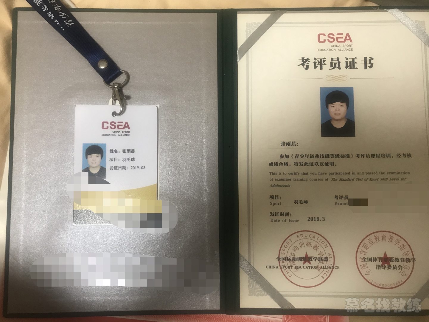 带出过u系列市冠军2人,省冠军1人,累计带教学员1000+ 全国羽毛球等级考级考评员证书