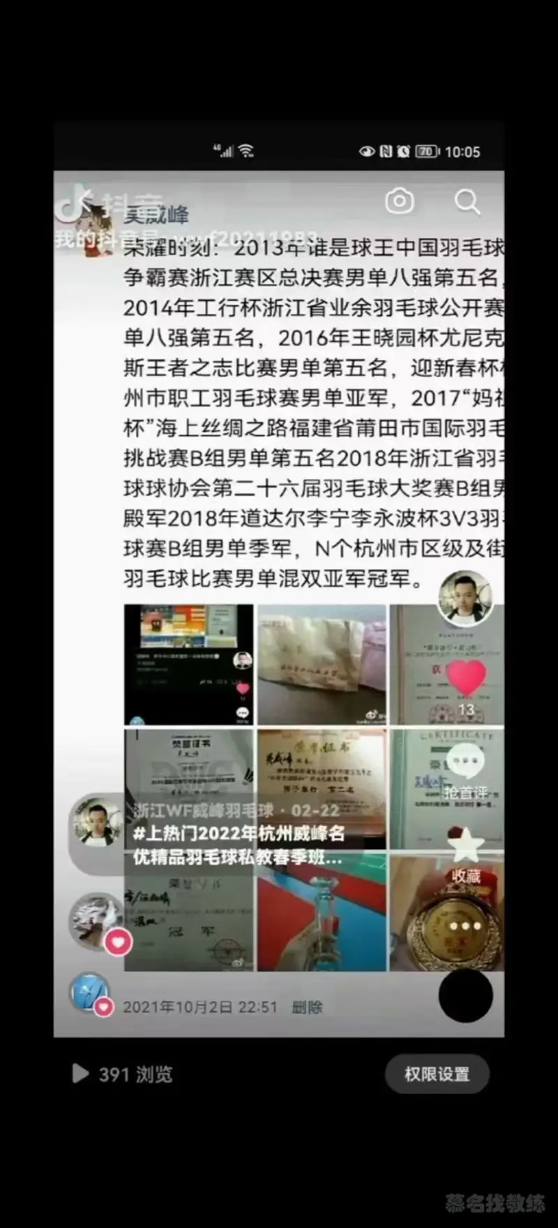 教学经历:浙江飞悦体育羽毛球培训主教练。