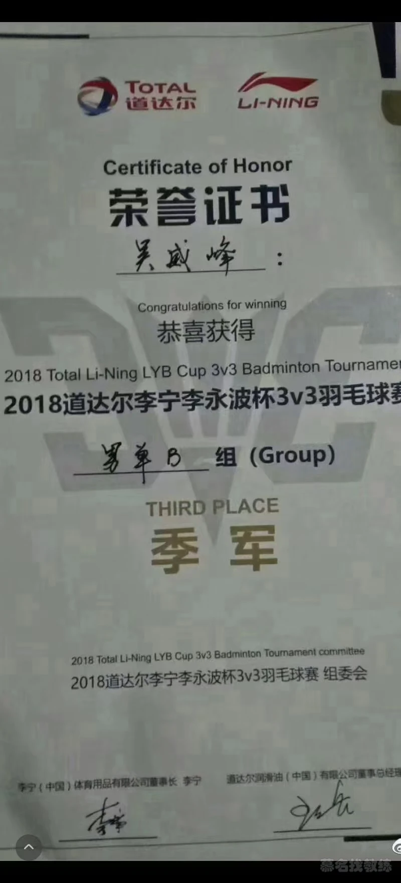 全国李永波3V3羽毛球比赛杭州站B组季军