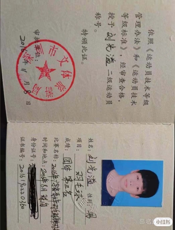广东省羽毛球锦标赛双打第三、广东省锦标赛男子团体第三、深圳市少儿羽毛球比赛单打第二、深圳市羽毛球比 赛双打第二、⻰岗区羽毛球比赛单打第一名、⻰岗区羽毛球比赛混双第一名、深圳市羽毛球比赛单打第五、深圳市 羽毛球比赛团体第二、深圳市体彩杯羽毛球比赛单打第三名、深圳市体彩杯团体第三、深圳市羽毛球选拔赛单打 第二名、深圳市运动会双打第二名、深圳市体彩杯双打第二名、深圳市市运会双打第二名、深圳市体彩杯团体第一 名、深圳市运动会团体第三名等 广东省锦标赛和羽毛球国家二级运动员证书