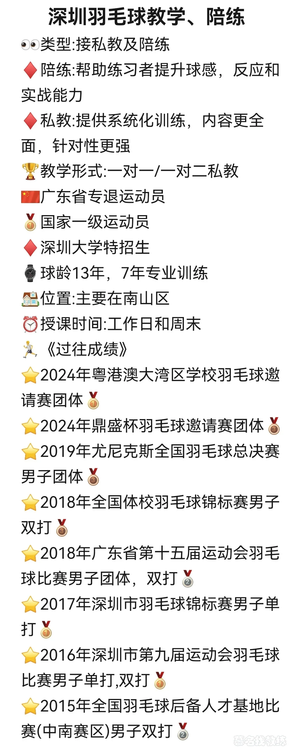 🇨🇳广东省专退运动员🏆2019年获国家一级运动员🏠深大特招生🌈初级教练员🏸全国羽毛球总决赛团体🥉🏸全国体校锦标赛男双🥈🏸广东省运动会男双男团🥈🏸深圳市运动会单双打🥇