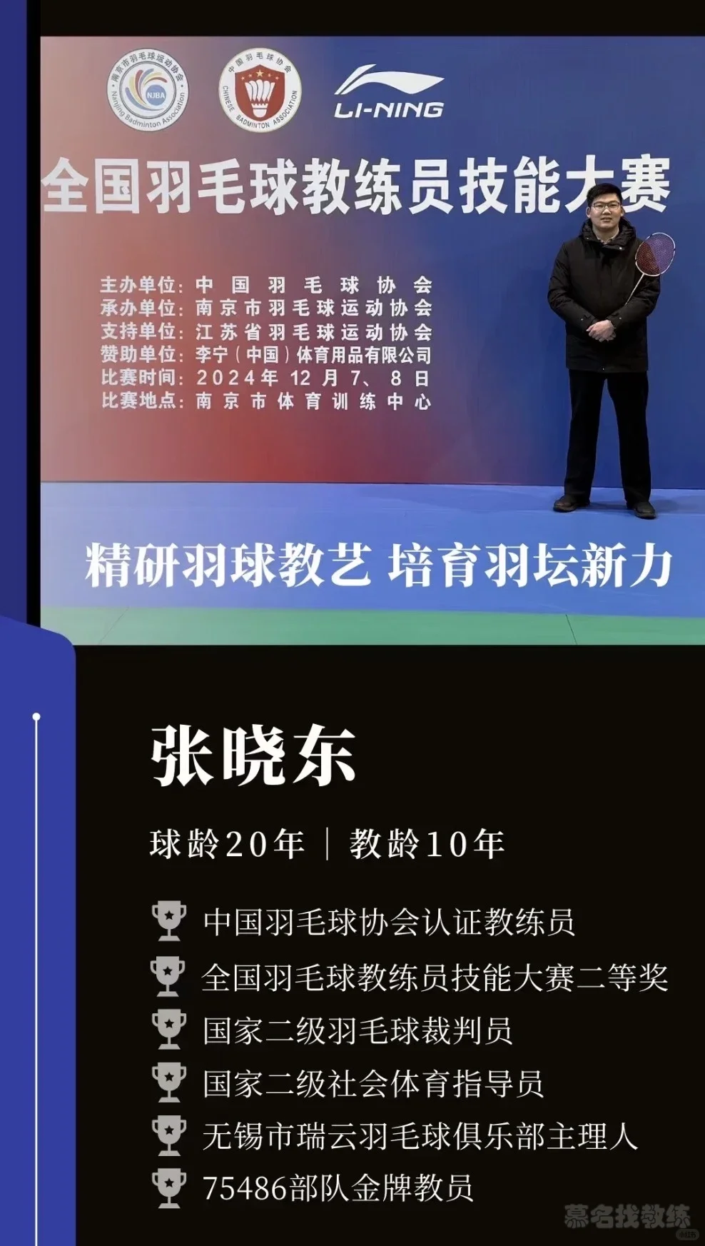 中羽协认证教练,拿过全国羽毛球教练员技能赛二等奖🥈,曾任广西J区教员。现任职驻锡某部队,区级机关队、区青少年宫教练,还是国家注册社会体育指导员、羽毛球裁判,欢迎联系培训、执裁