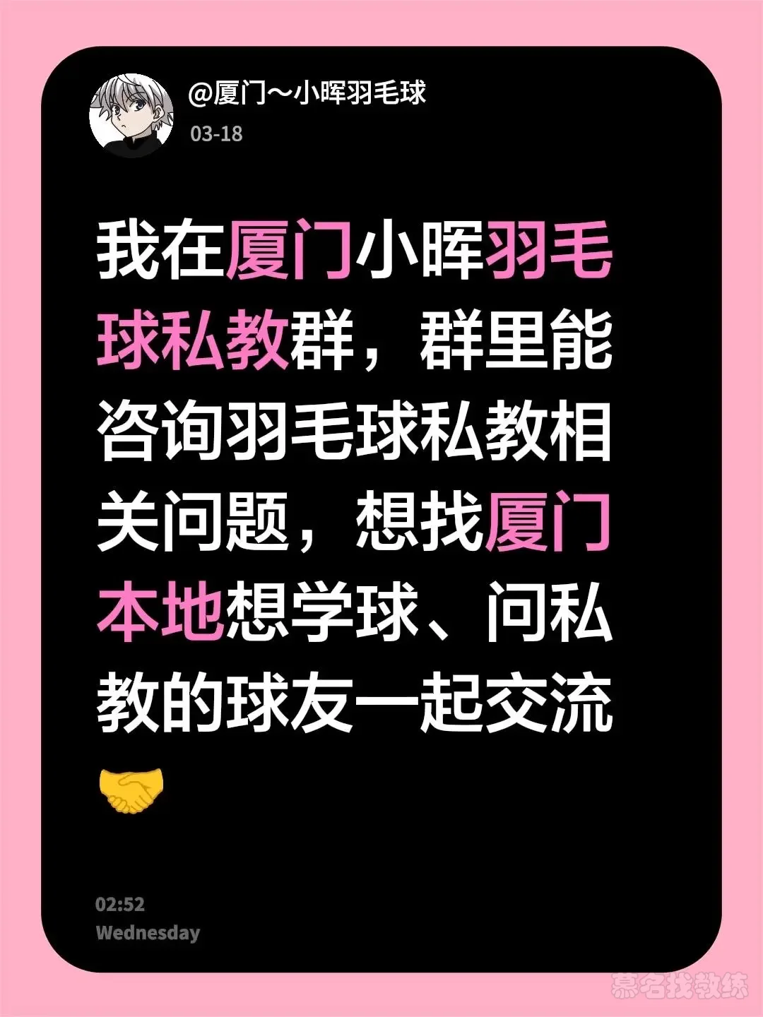 国家二级羽毛球运动员浙江省第三🥉🎉小晖羽毛球俱乐部总教练厦门私教团队/身体功能性训练/运动损伤康复☎️***********