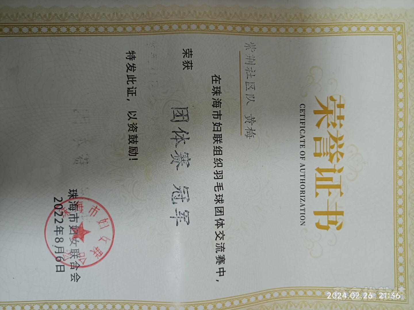 2.2022珠海市妇联组织羽毛球团体赛冠军