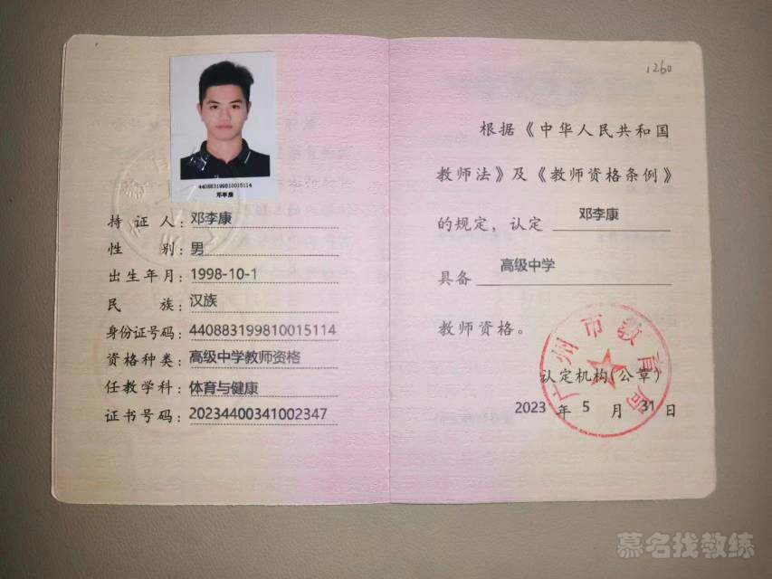 姓名:邓李康 籍贯:广东吴川 教学经历: 执信中学校队教练 2024广州市越秀区“教师基本功大赛”获得“一等奖” 2023执信中学高中篮球校队越秀区第一名 2023执信中学初中足球校队越秀区第二名,并获教育局颁发的”优秀教练员” 2021广州体育学院可授予运动员等级篮球比赛“粤汇杯”第三名 2018学院新生杯篮球赛第一名 本人已获得高级中学教师资格证、篮球二级裁判;游泳、排球、羽毛球三级裁判证书;国家救生员、国家中级游泳社会体育指导员等证书。 8年运动训练经验,担任过中学体育教师,长年接触国家一二线篮球训练课程和方式,熟悉运动训练教法与学法。 大部分学生都需要通过运动锻炼身体,提高自信。但身边缺少 专业老师有针对性的指导和带领,缺乏动力。本培训是为了使学生 能够正确得到锻炼,培养对运动的兴趣,提高身体素质和灵敏度 速度以及身体形态。希望帮助真正热爱体育和渴望提升运动能力 的学生,助你在运动场上展翅高飞, 课程模式:1对1,1对2,小班课(4~6人)等实际可开展课程模式 课程:少儿课程分入门教练(10课时),初级提升教学,中级进阶教学(20课时),高级突破教学;成人入门教学(6课时),成人陪练等 培训内容: 1.提高学生的身体素质(起跑/加速跑/冲刺跑/耐力跑,弹跳/速度/ 柔韧/耐力/核心等基本的身体素质和协调性练习); 2.篮球基本功(运球、投篮、脚步) 3.培养篮球意识和规则;根据不同学员的要求和年龄,制定不同 的训练方案。 培训对象:儿童成年人均可 训练时间:双方协调 训练地点:上门服务/地点灵活 常驻训练场地:天河区苏元,柯木塱 训练装备:篮球运动服 大部分学生都需要通过运动锻炼身体,提高自信。但身边缺少 专业老师有针对性的指导和带领,缺乏动力。本培训是为了使学生 能够正确得到锻炼,培养对运动的兴趣,提高身体素质和灵敏度 速度以及身体形态。希望帮助真正热爱体育和渴望提升运动能力 的学生,助你在运动场上展翅高飞