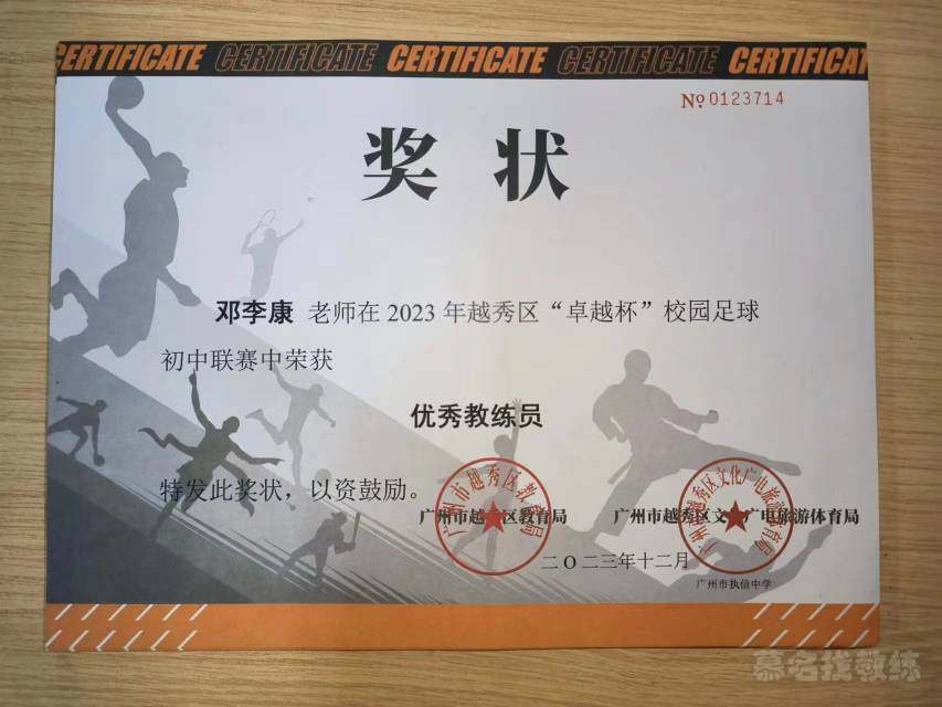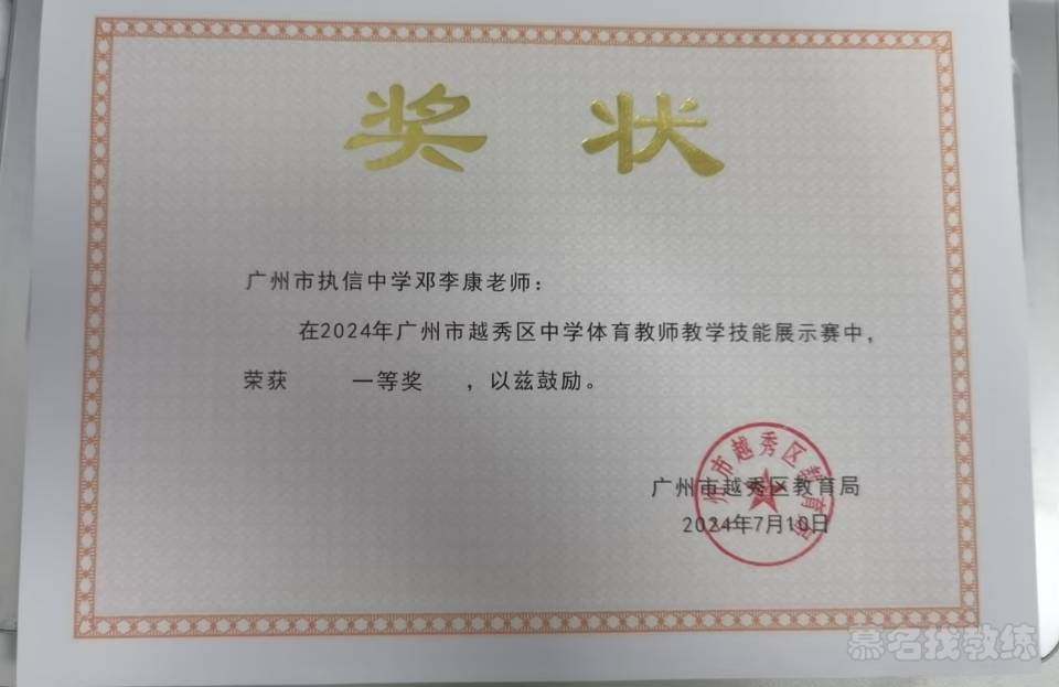 本人已获得高级中学教师资格证、篮球二级裁判;游泳、排球、羽毛球三级裁判证书;国家救生员、国家中级游泳社会体育指导员等证书。 2024广州市越秀区“教师基本功大赛”获得“一等奖” 2024广州市中学生运动会足球初中组第一名 2023执信中学高中篮球校队越秀区第一名 2023执信中学初中足球校队越秀区第二名,并获教育局颁发的”优秀教练员” 2021广州体育学院可授予运动员等级篮球比赛“粤汇杯”第三名 2020广州市大龙中学”优秀田径裁判员” 2019广州体育学院校运会游泳比赛男子100米自由泳第二名 2018粤港澳台游泳锦标赛200米自由泳第八名 2018学院新生杯篮球赛第一名 教师基本功大赛一等奖 广州市越秀区优秀教练员 越秀区高中篮球比赛第一名