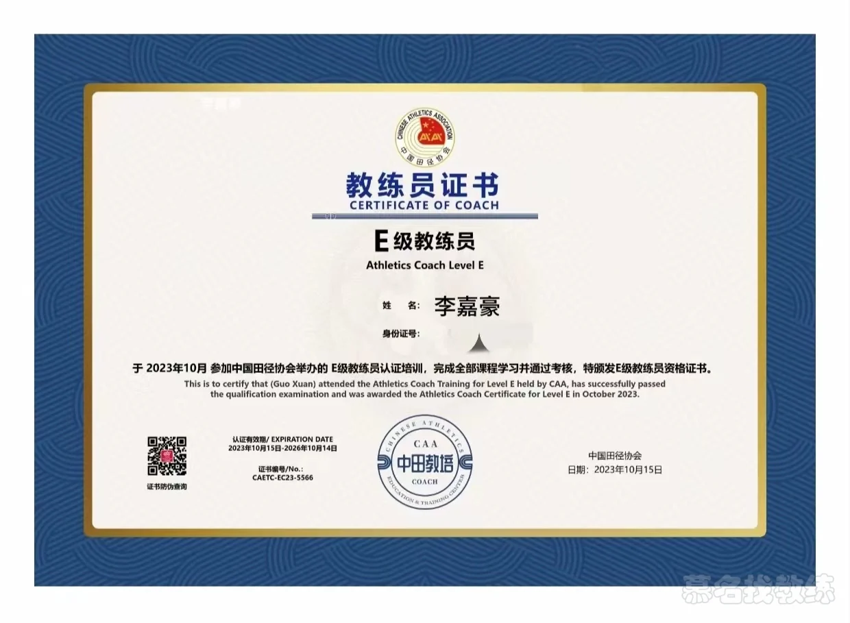 获得证书:国家认证篮球教练员,田径、体适能教练员