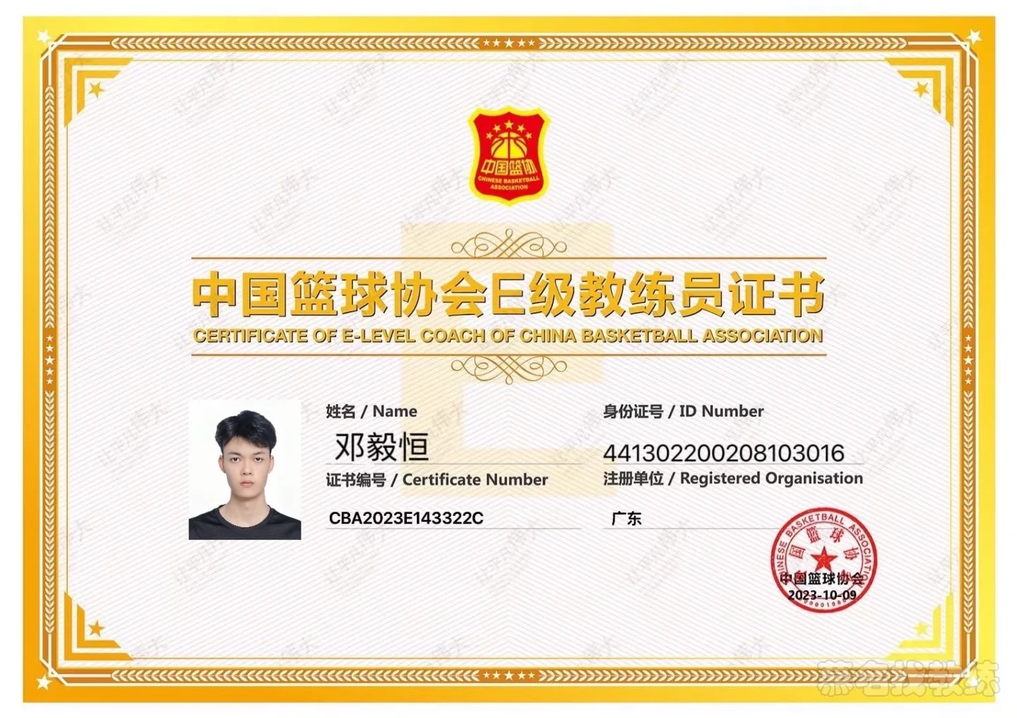 中国篮协E级教练员证书