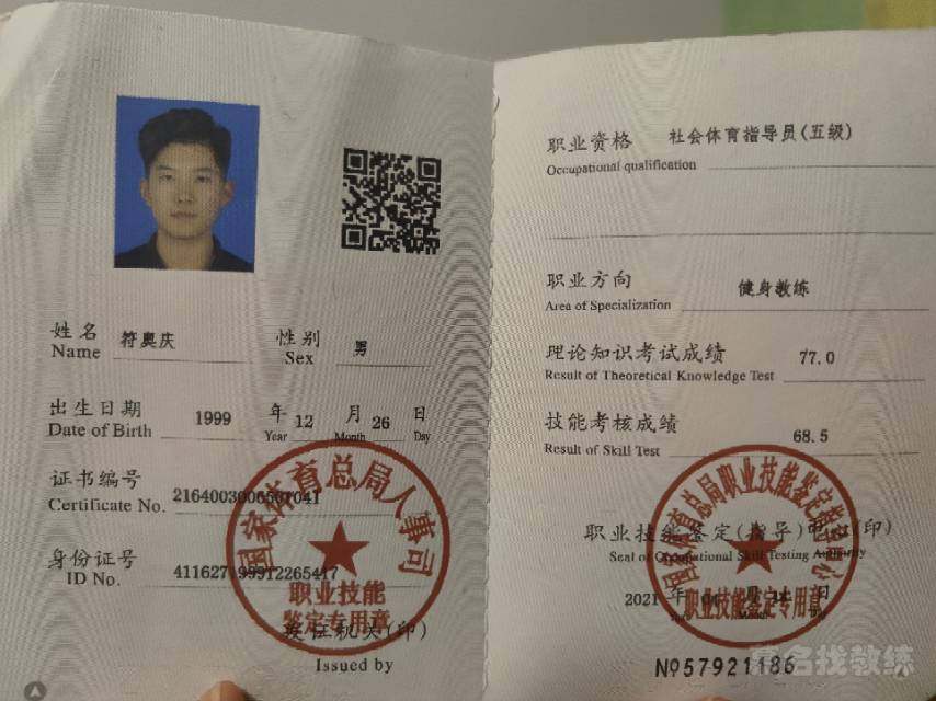 1. 2020年获得黑格力斯健身学院高级健身教练认证 2.2021年完成义罗拳击培训,获得等级一证书 义罗拳击认证 拳击棍靶认证 健身学院私人教练认证 红十字认证 优秀教练
