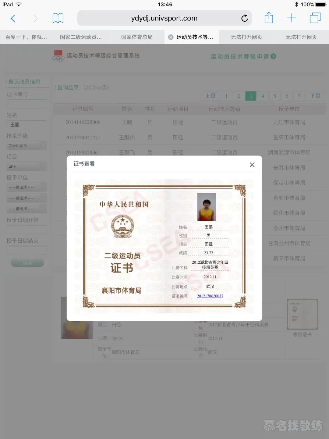 1. 2012年前后获得田径200米、标枪、铁饼三各项目国家二级运动员证书