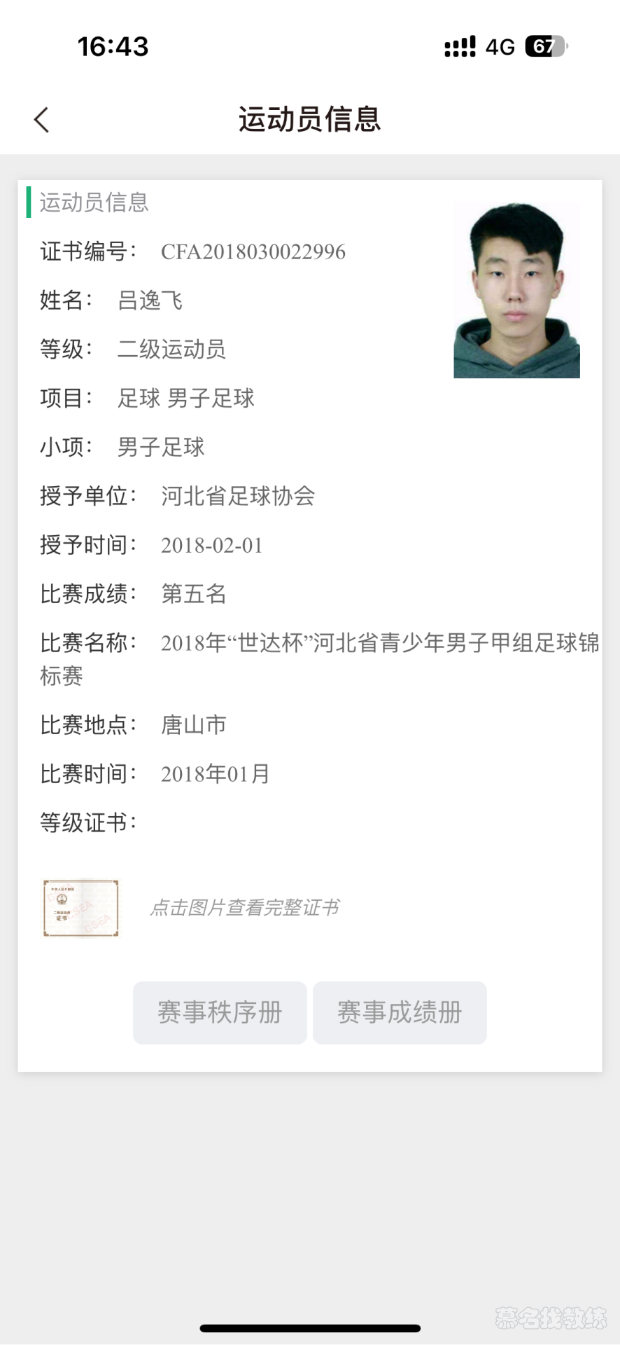 足球 5年教龄 二级运动员