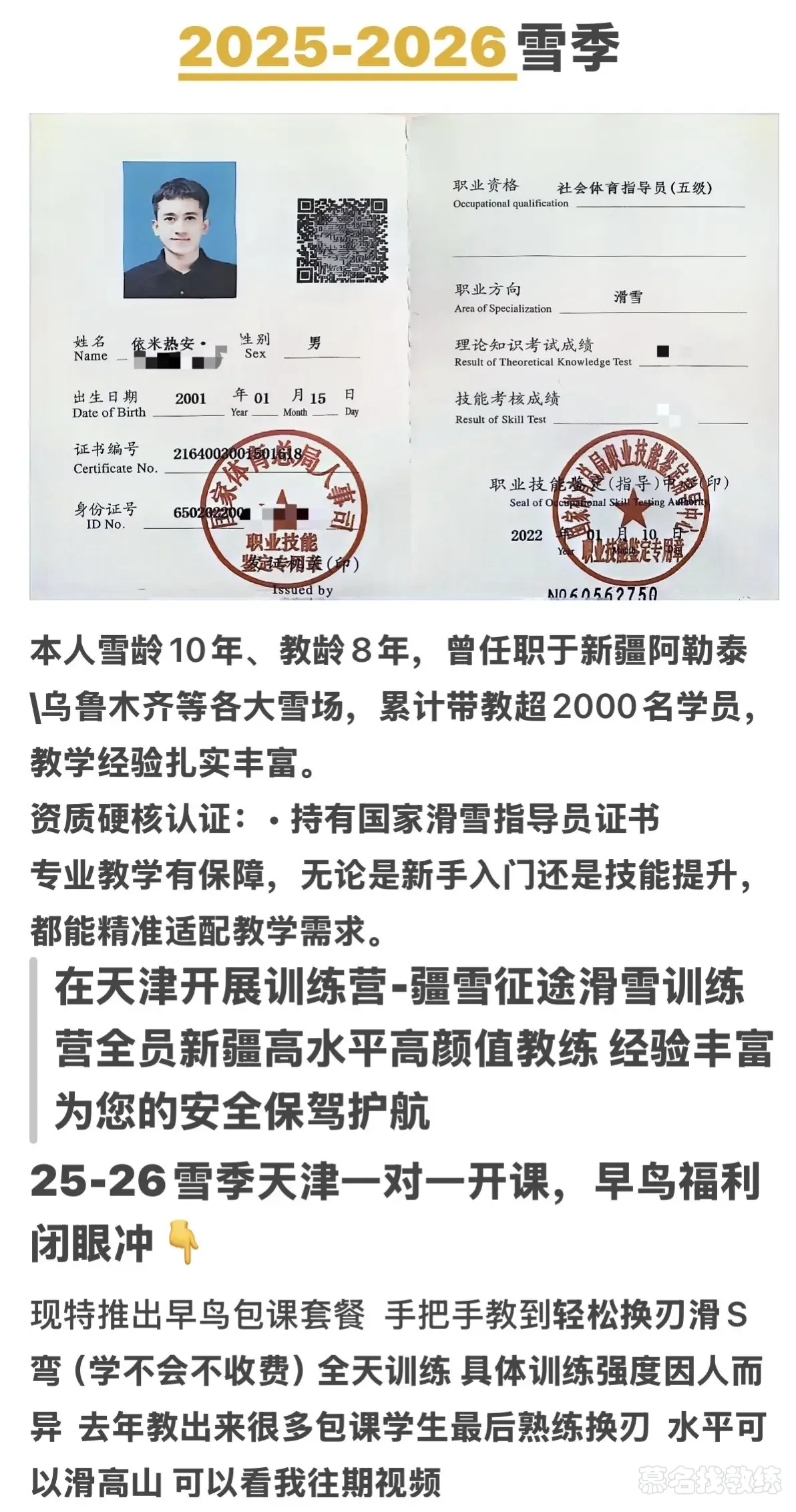 资格证书: 国家职业认证滑雪教练