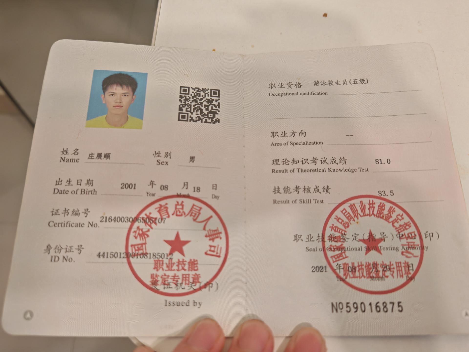 国家社会体育游泳救生员认证 国家社会体育游泳指导员证 广东省红十字救护员认证 广东省体育职业学校 2020年9月汕尾“铜鼎山杯”游泳公开赛荣获男子50米自由游 2020年11月广东省“救生技能大赛”荣获团体三等奖 游泳教练证