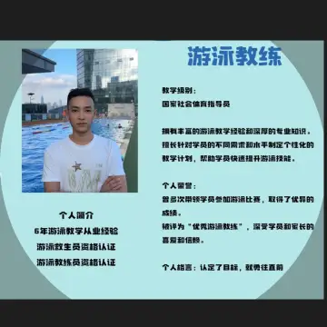 教学级别:国家社会体育指导员拥有丰富的游泳教学经验和深厚的专业知识。擅长针对学员的不同需求和水平制定个性化的教学计划,帮助学员快速提升游泳技能。个人荣誉:曾多次带领学员参加游泳比赛,取得了优异的成绩。被评为“优秀游泳教练”,深受学员和家长的喜爱和信赖。个人格言:认定了目标,就勇往直前