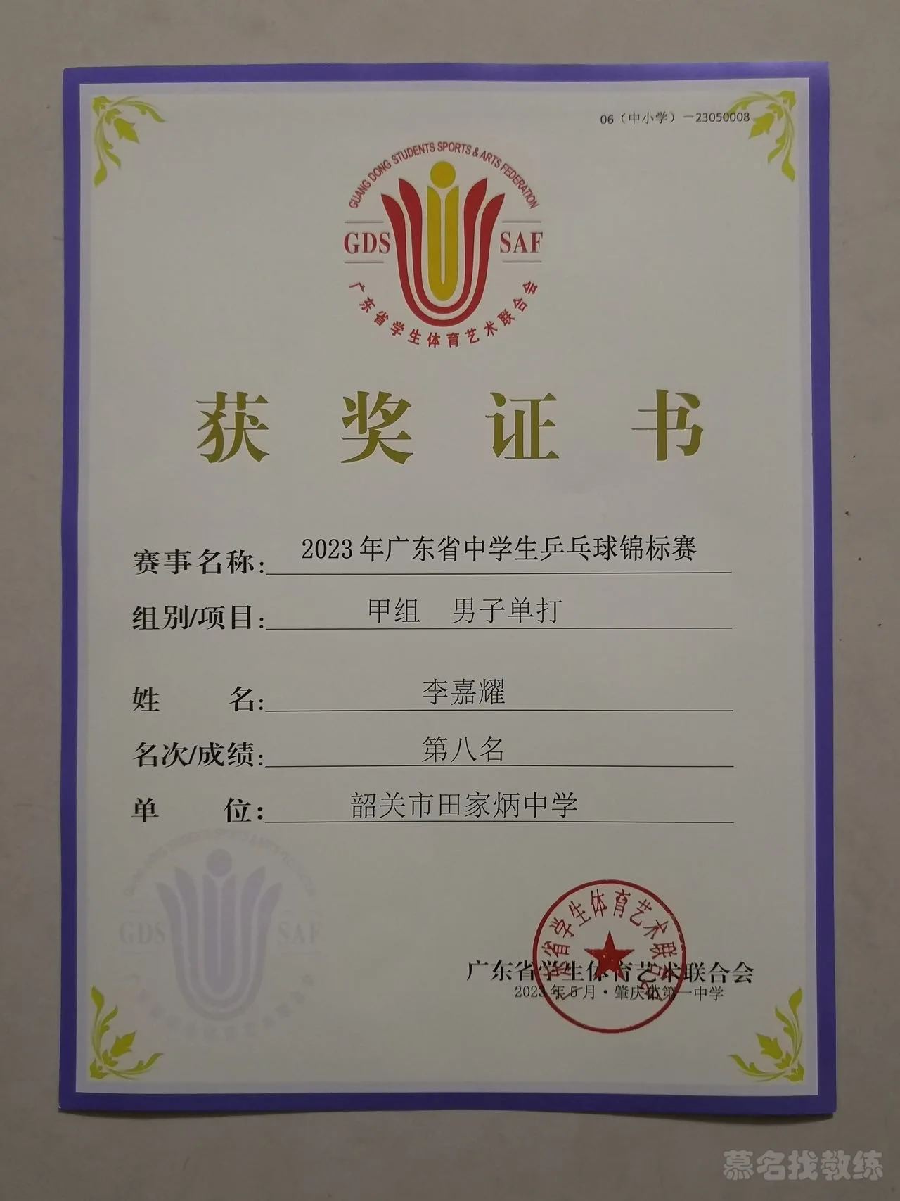 2023年广东省中学生乒乓球锦标赛,荣获甲组男子单打第八名
