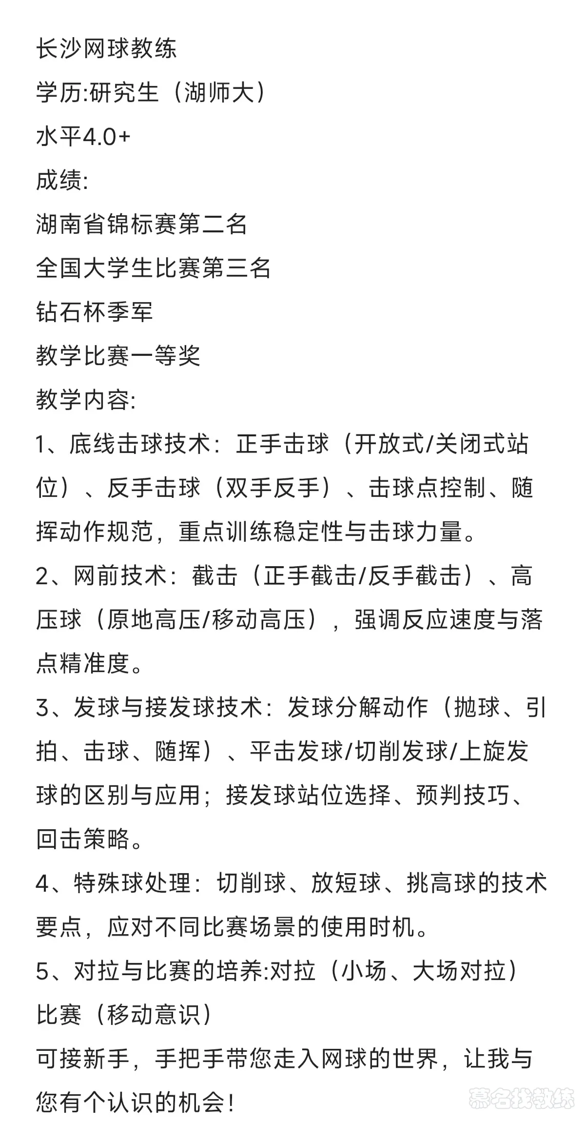 学历:硕士研究生水平:4.0+Itf教练湖南省锦标赛第二名全国大学生比赛第三名学球陪练私聊