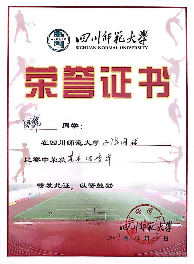 1. 中国大学生网球锦标赛西南赛区丙组团队🥇 2.四川省智博杯混双第三 3.四川省教研产网球比赛女子单打🥇 4.四川省成都市全民健身女子单打🥇 校园女子单打第二名 网球教学基本功季军 成都市健身单打第二 智博杯混双第五