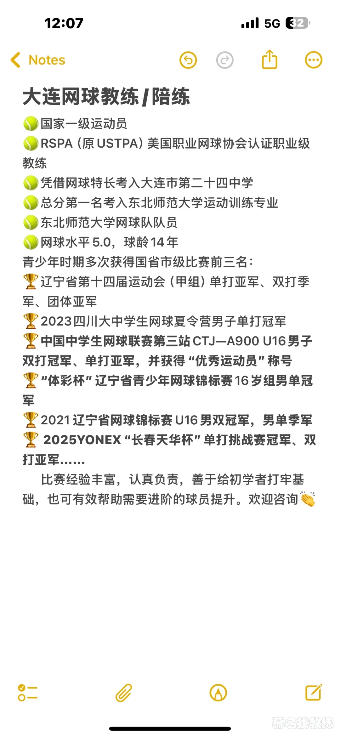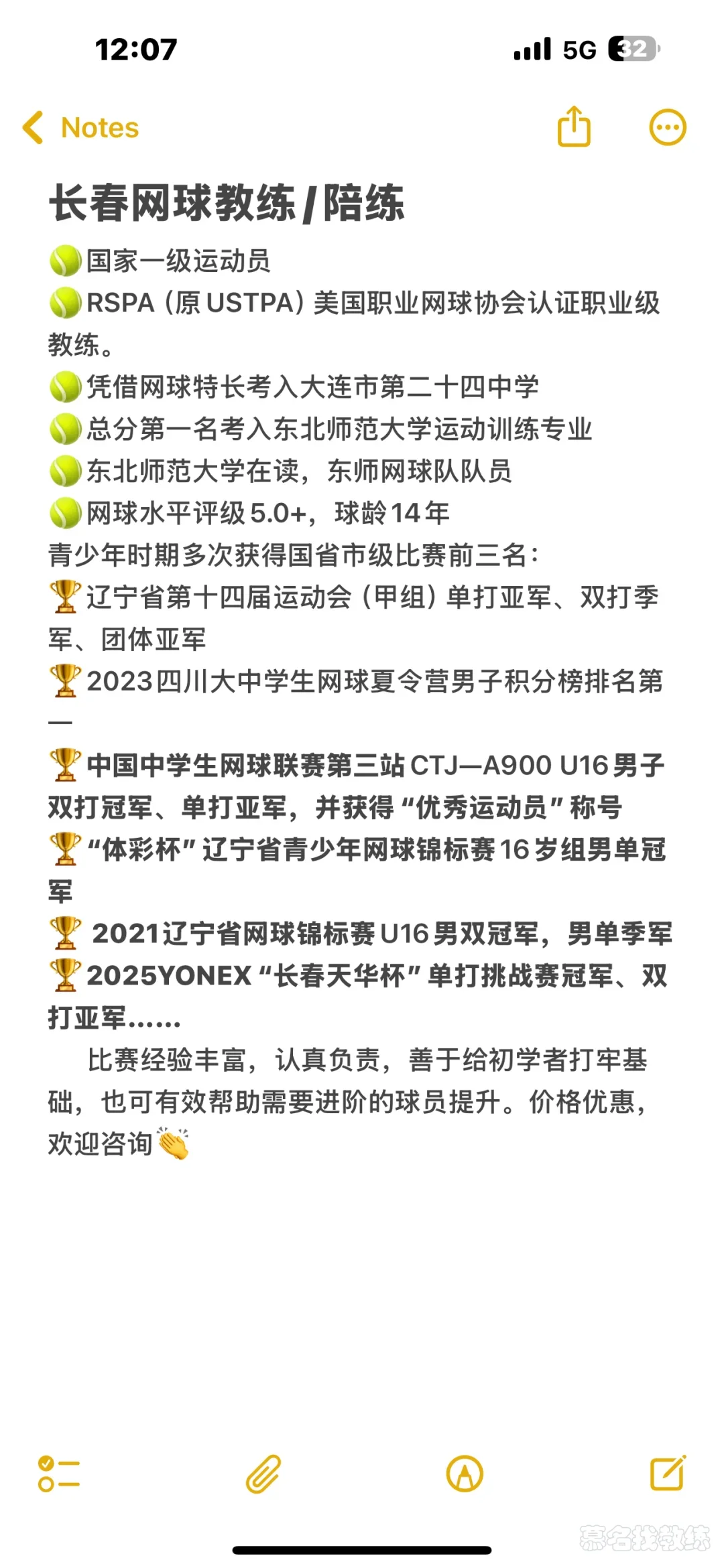 国家一级网球运动员,东北师范大学运动训练专业