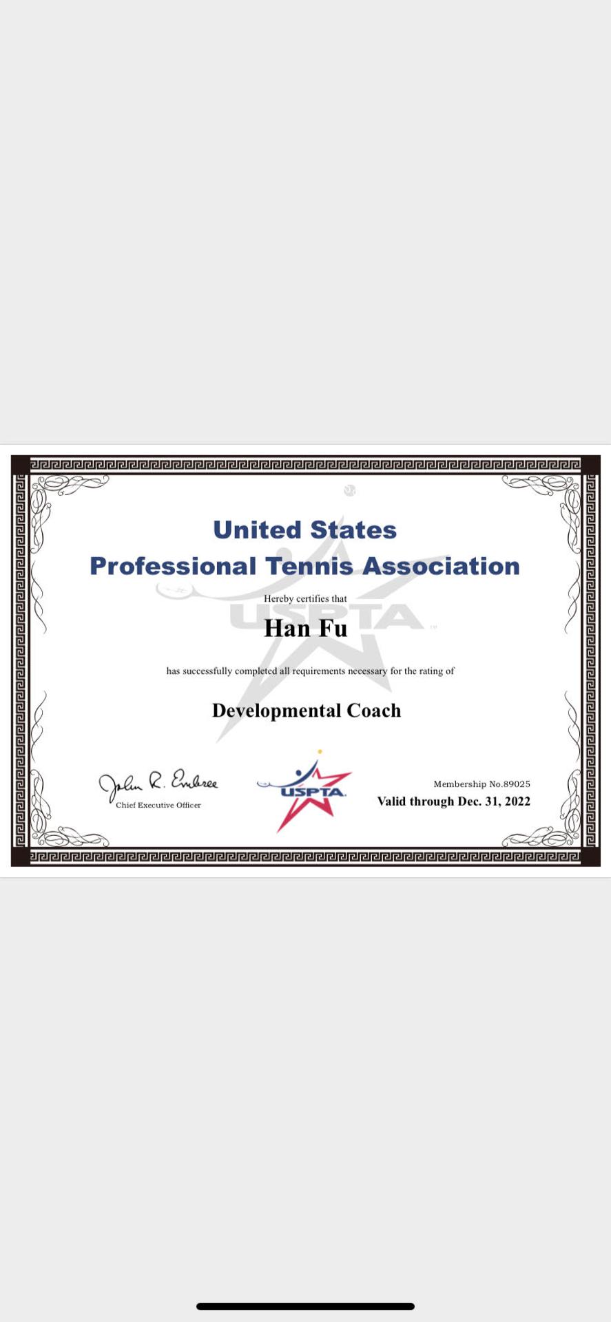 姓名:付晗 籍贯:四川成都 教学经历:2011年开始接触学习网球,2014年从事网球教学工作, USPTA美国职业网球协会教练认证 美国PTA AD认证教练 KIDS TENNIS 教练认证 累计服务学生:200左右 擅长领域:双手反拍,截击技术 课程模式:1对1,1对2,成人陪练 课程流程:入门教练(10课时),初级提升教学,中级进阶教学(20课时),高级突破教学;成人入门教学(6课时) 培训对象:成人及少儿 训练时间:双方协调 训练地点:上门服务/地点灵活 训练装备:如需学员提前准备状态,或可为学员提供,请说明情况