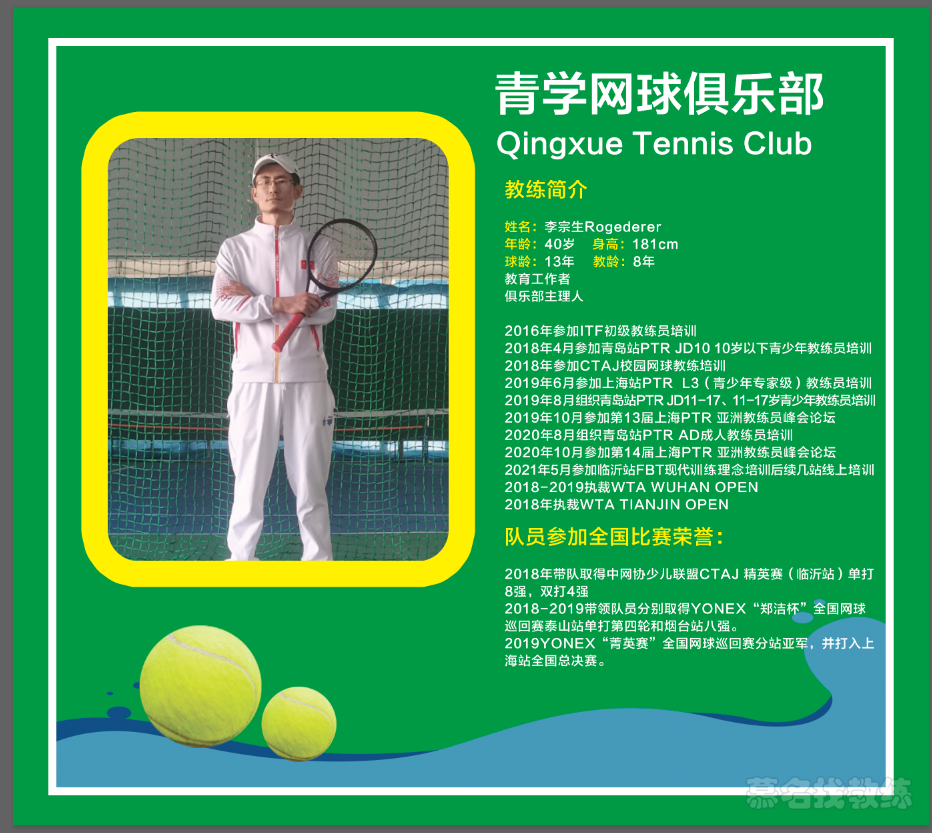 本人水平4.0,教学十年,成人和青少年学员百余人。 青学网球俱乐部创办人,三片室内一片室外场地 因材施教,幽默,严谨,科学。 课程模式:1对1,1对2 课程流程:初级提升教学,中级进阶教学,高级突破教学;成人入门教学 2016年参加ITF初级教练员培训 2018年4月青岛站PTR JD10(10岁以下青少年)教练员培训 2018年参加CTAJ校园网球教练培训 2019年6月参加上海站PTR L3(青少年专家级)教练员培训, 2019年8月青岛站PTR JD11-17(11-17岁青少年)教练员培训 2019年10月参加第13届上海PTR 亚洲教练员峰会论坛 2020年8月组织青岛站PTR AD成人教练员培训2020年10月参加第14届上海PTR 亚洲教练员峰会论坛 2018-2019执裁WTA WUHAN OPEN2018年执裁WTA TIANJIN OPEN 2020之后,先后参加FBT线上线下多站培训。