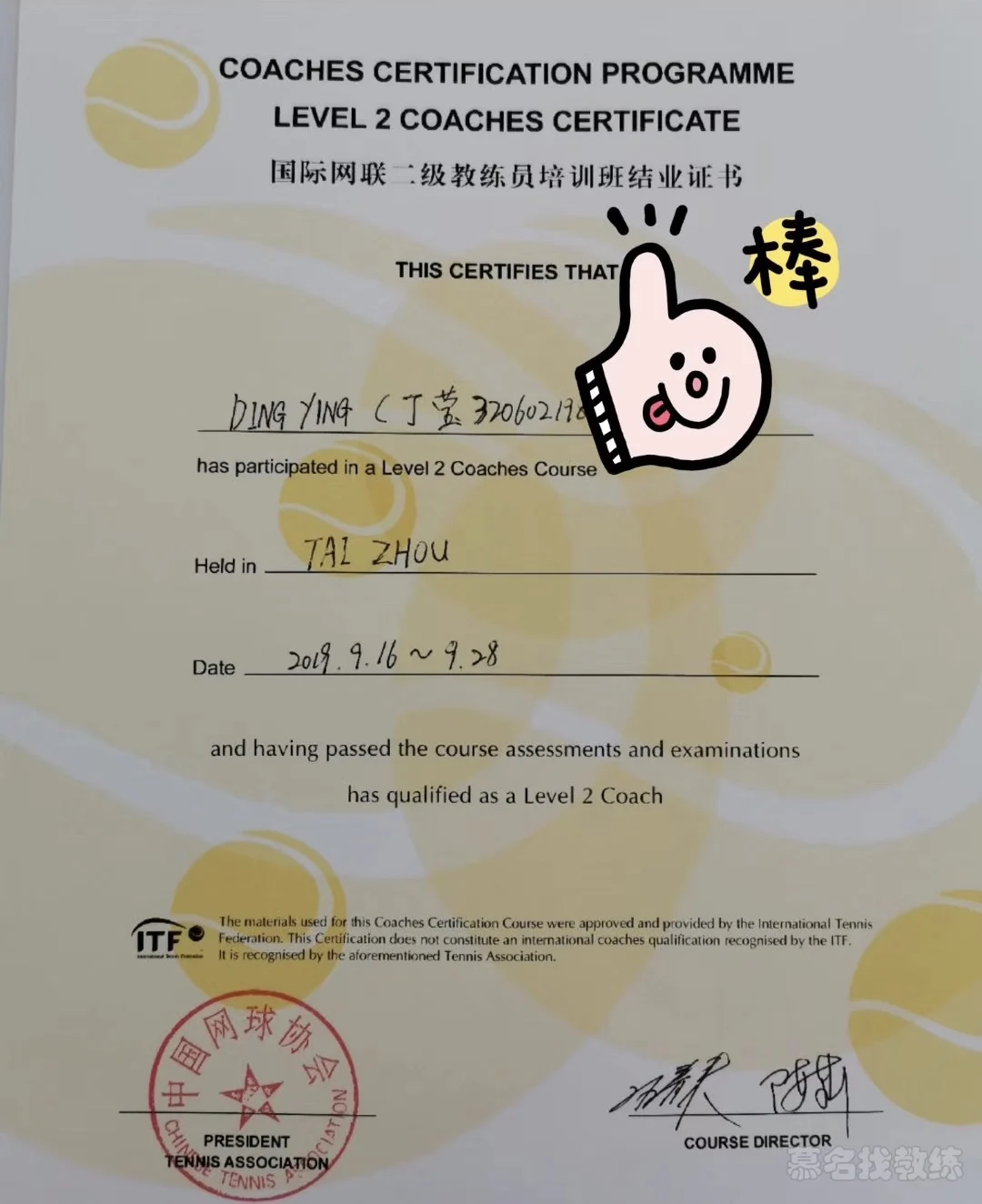 运动员等级:国家一级 (网球)ITF高级教练员