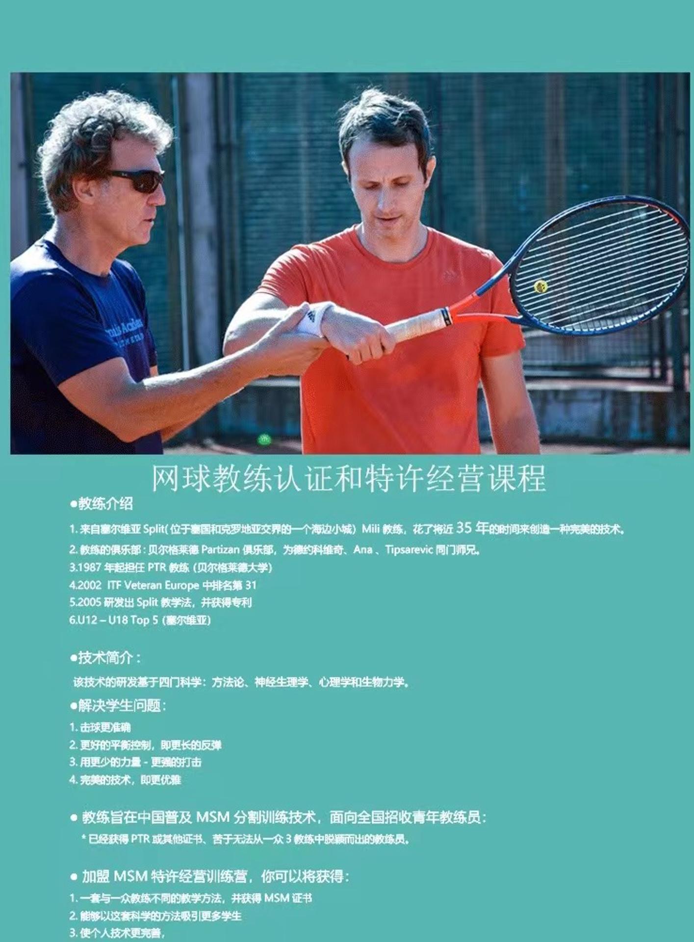 Mili S lit Veljkovic PTR PRO级教练,来自Patiza 网球俱乐部(贝尔格莱德), 与诺瓦克·德约科维奇(Novak Djokovic)、安娜·伊万诺维奇、蒂普斯雷维奇等网球明星同出师门, 担任贝尔格莱德大学 PTR 职业教练,于美国比佛利山地区专为影视明星名人、VIP客户服务, 提供高端私教课程长达15年。 2.U12-U18 top 5. 3.2002年在ITF VETERAN EUROPE 排名21. 3.退役后并在该俱乐部执教超过三十五年,在Mili教练三十多年的教学生涯中, 培养出大量优秀的运动员及教练员。 4.师从MILI教练的Vemic现为德约科维奇教练组成员之一。 5.MSM网球课程正式创建于2005年,并获得课程以及器材专利专利。 许多球员在参加该课程之后已经迅速的进步,或者已经成为他们的俱乐部、城市或国家的顶级球员之一。 6.Mili学生Vemic为德约科维奇教练团队重要成员,他在团队担任战术顾问。 技法宗旨:旨在提高初级球员和参加锦标赛的活跃休闲球员的单手反手; 提高击球准确率;调高技术的稳定性。 2021-深圳设立MSM诊所课程体系,35年教学经验的结晶。 目前可在深圳罗湖区自有场地怡景花园授课,也可全国出差(学生负担差旅费)。 技术:MSM分割训练法 MSM网球诊所的课程专门为解决专业教练的问题而设计,课程实地在深圳市罗湖区怡景花园。