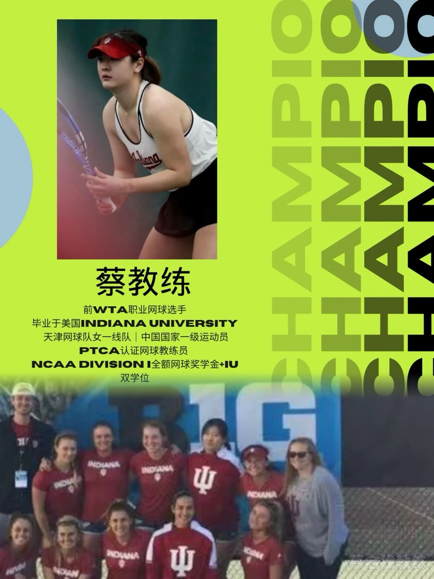 蔡教练:前WTA职业网球选手、美国印第安纳IU大学本科双学位、美国NCAA Division I网球全奖|天津网球队女一线队|国家一级运动员、健将。杨教练:美国网球协会USPTA教练员、美国UNLV市场营销学位+NCAA D II网球全奖|天津网球队