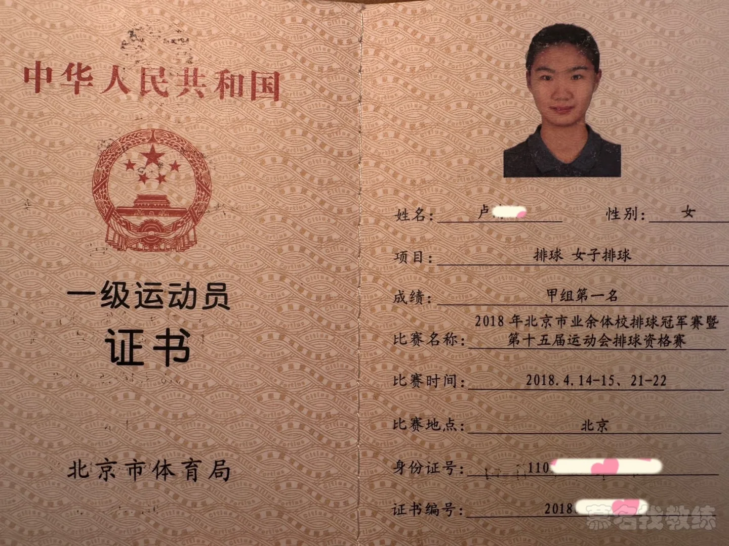 1. 国家排球一级运动员