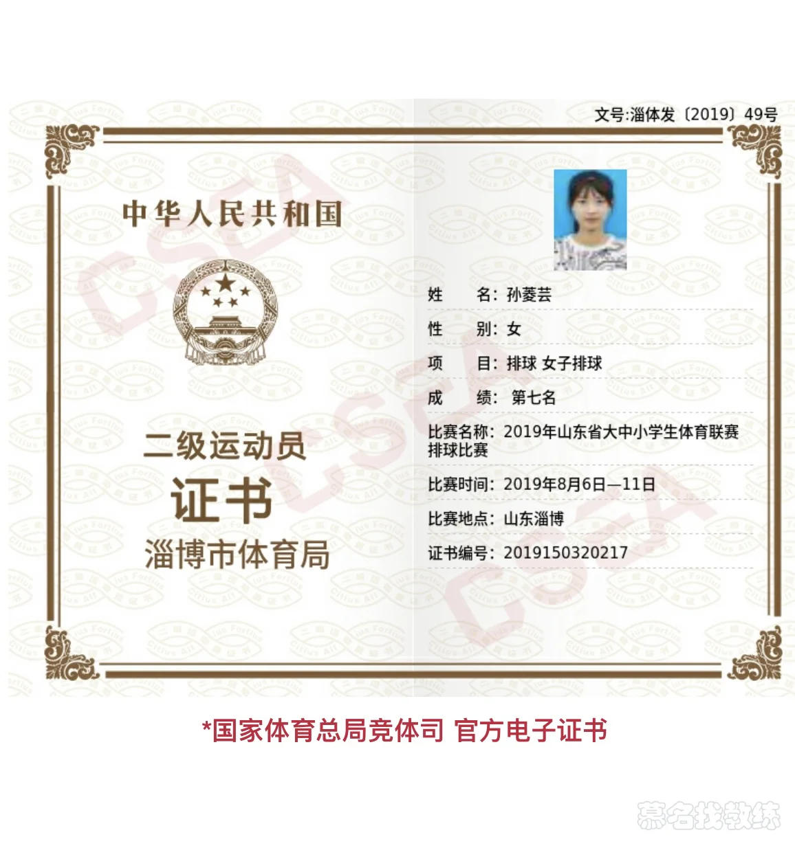 2019年成为国家二级运动员;