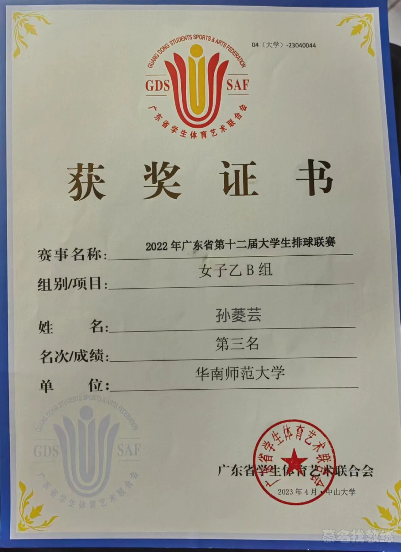 2022年广东省大学生排球联赛第三名