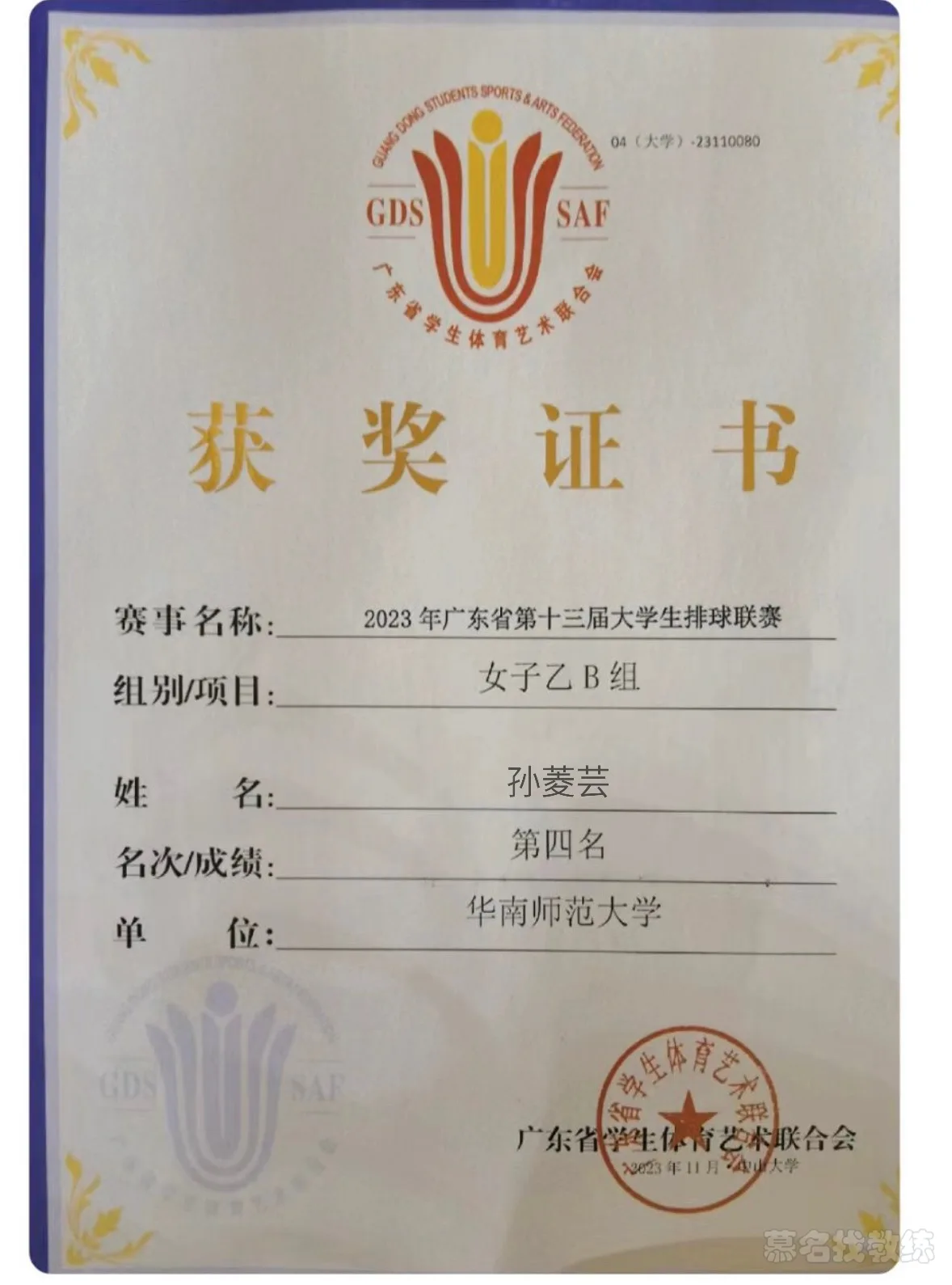 2023年广东省大学生排球联赛第四名