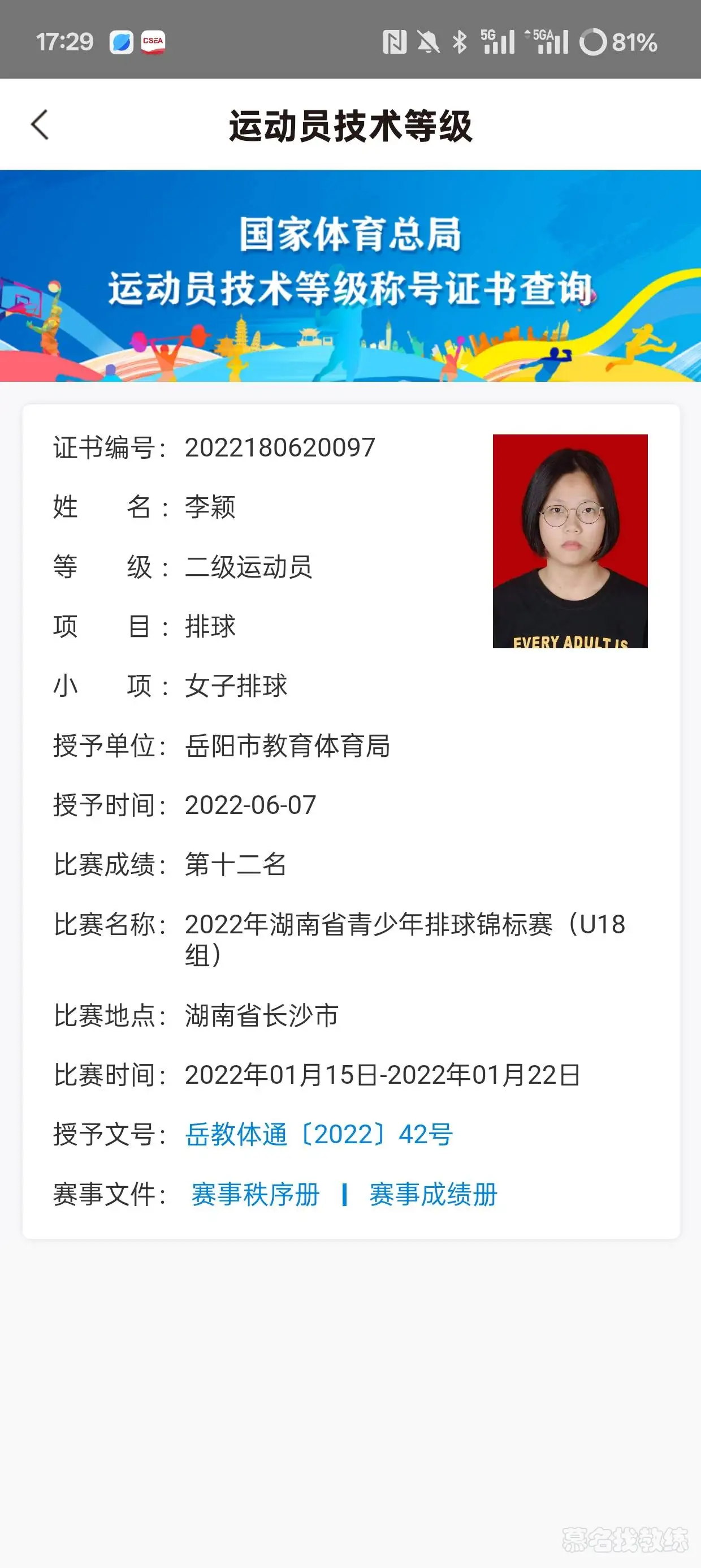 排球 3年教龄 二级运动员