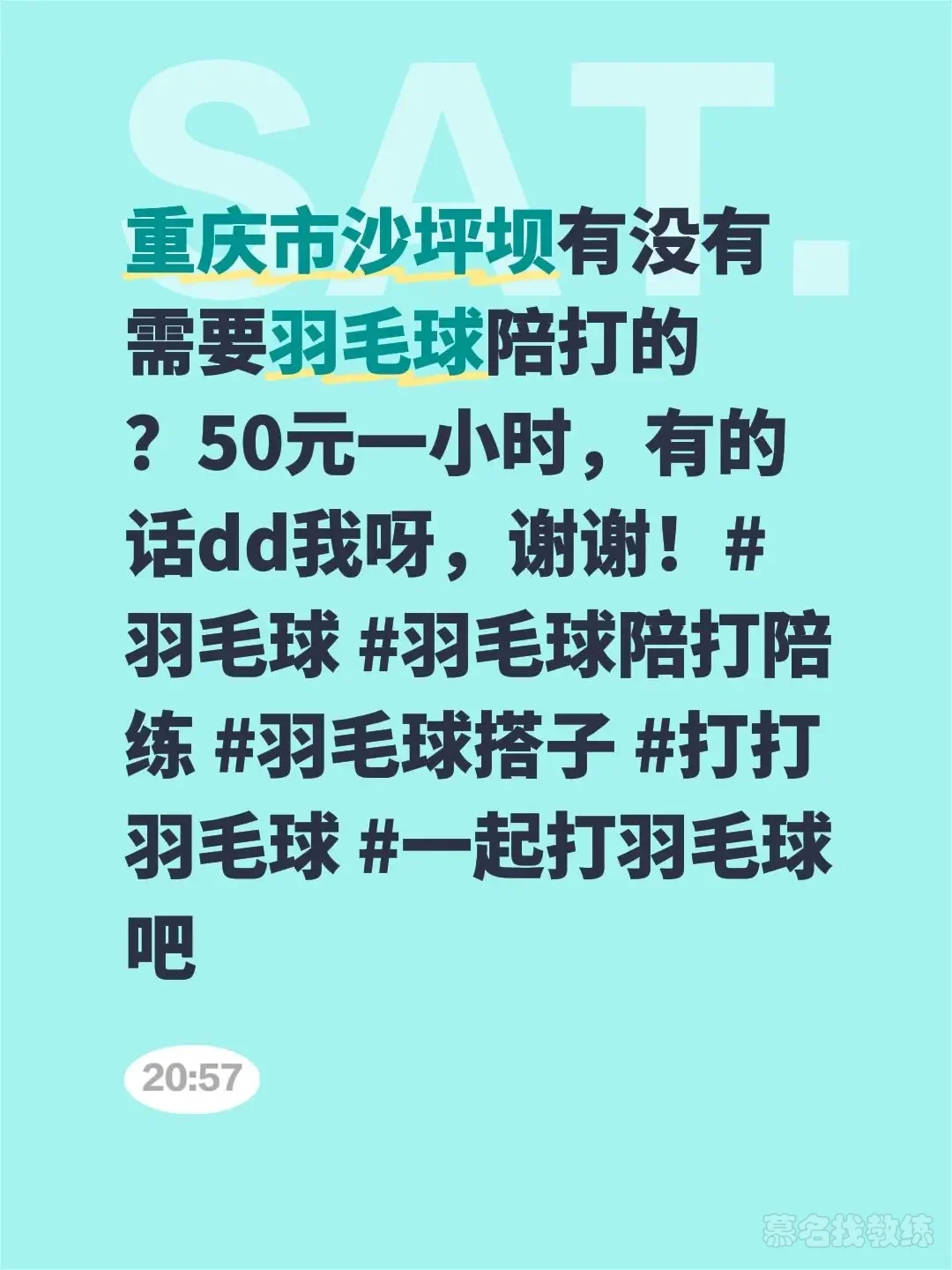 重庆市沙坪坝有没有需要羽毛球陪打的?50元一小时,有的话dd我呀,谢谢!