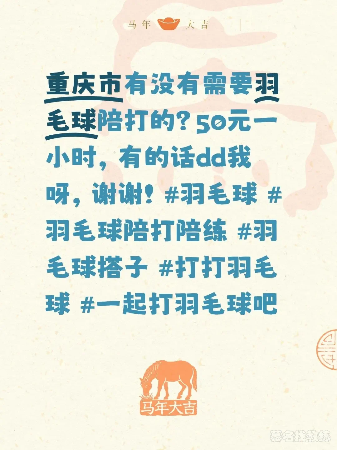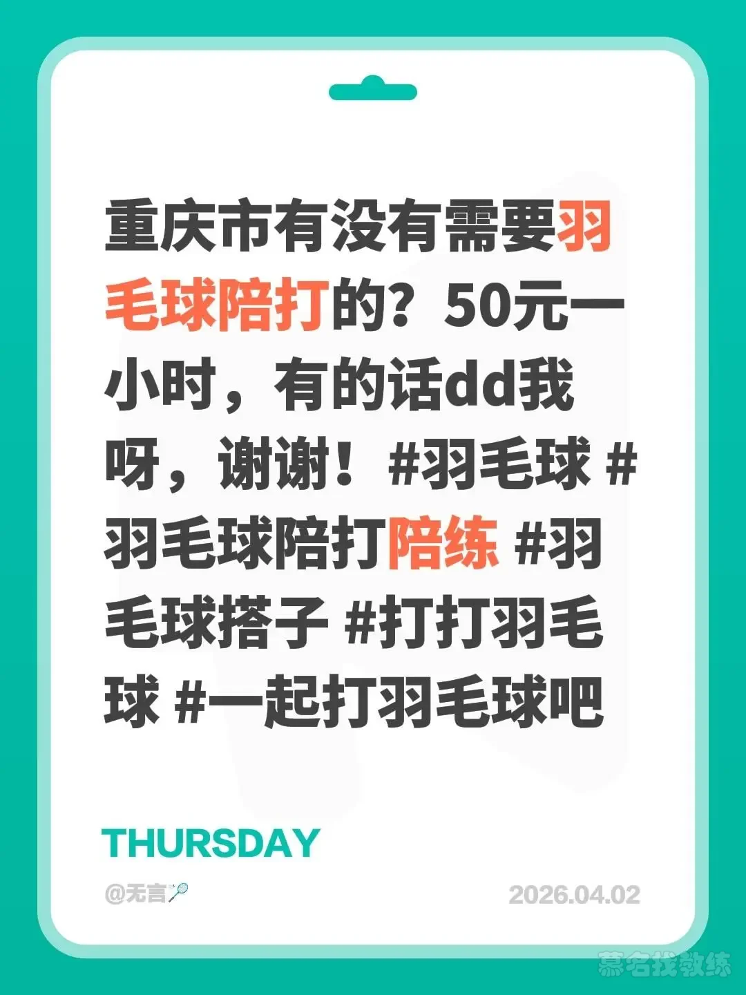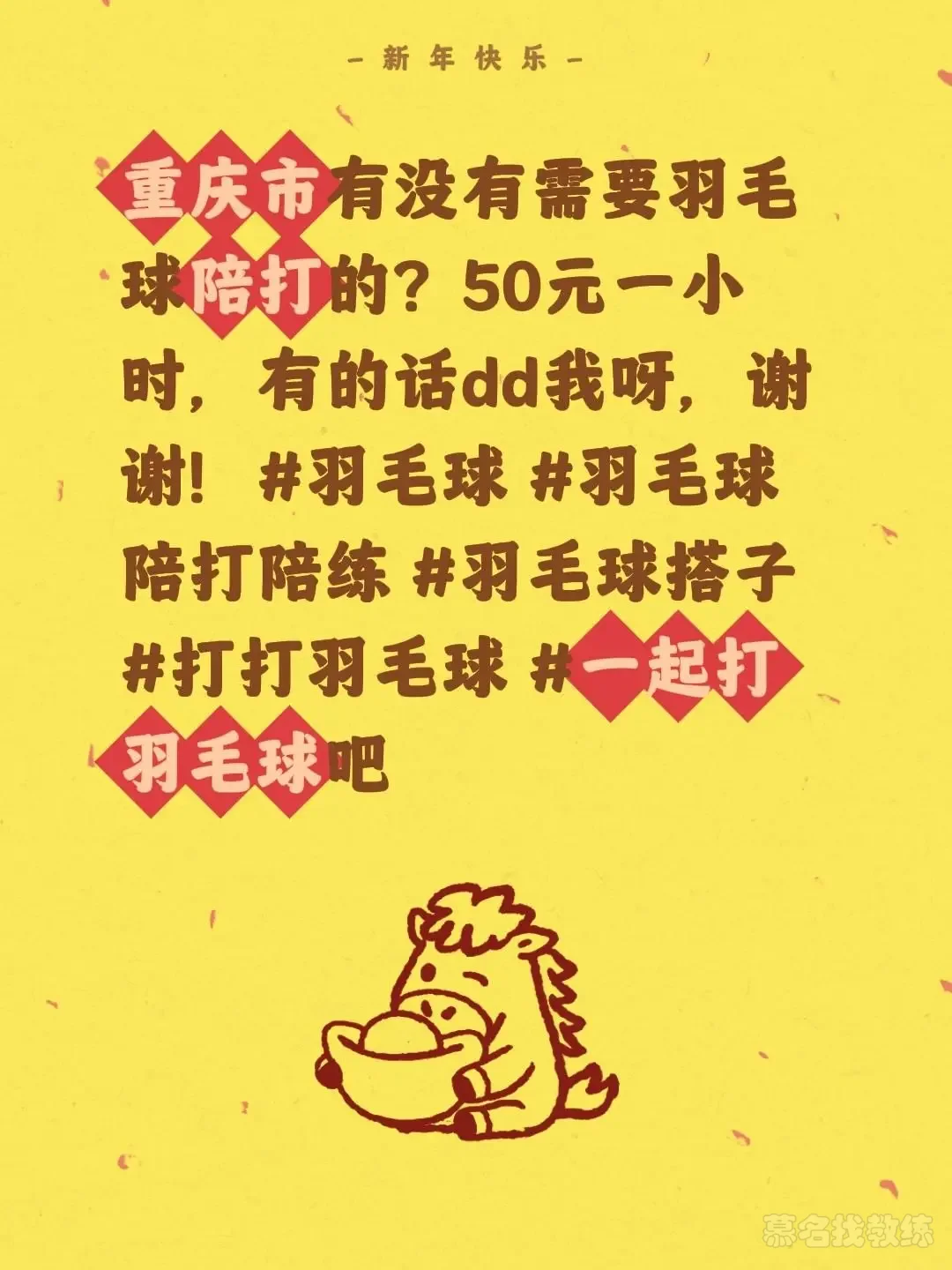 重庆市有没有需要羽毛球陪打的?50元一小时,有的话dd我呀,谢谢!