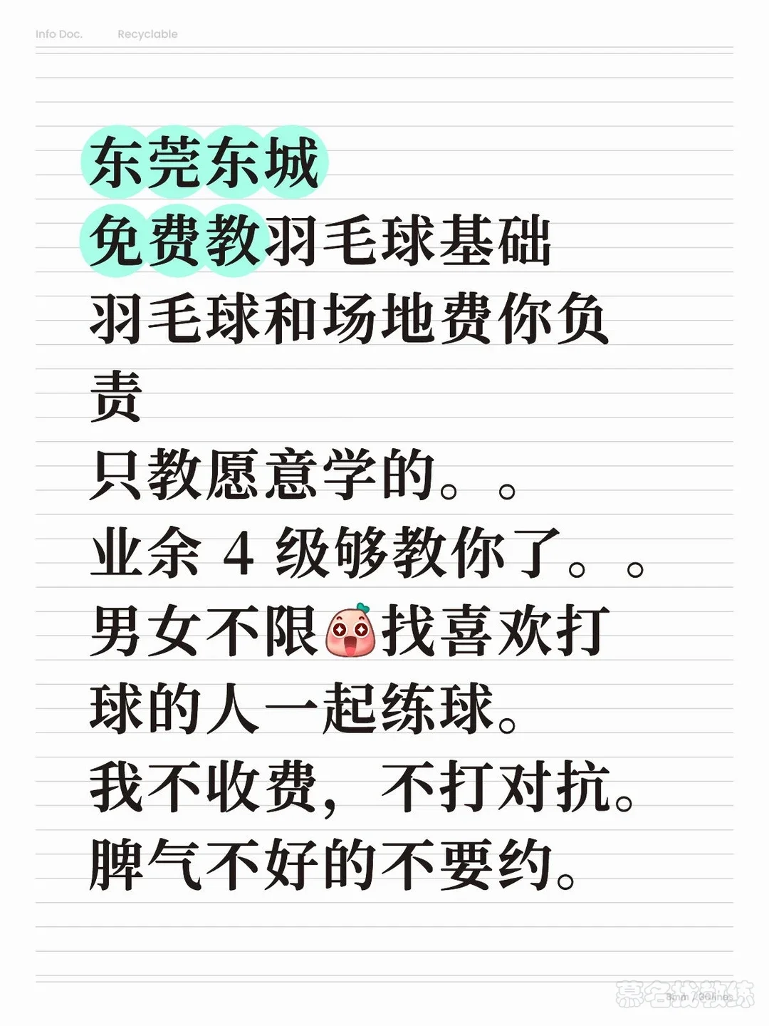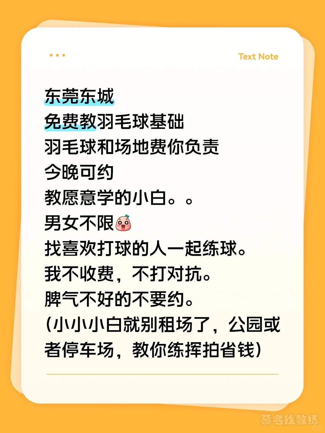 东莞东城免费教羽毛球基础羽毛球和场地费你负责只教愿意学的。。业余 4 级够教你了。。男女不限[哇R]找喜欢打球的人一起练球。我不收费,不打对抗。脾气不好的不要约。