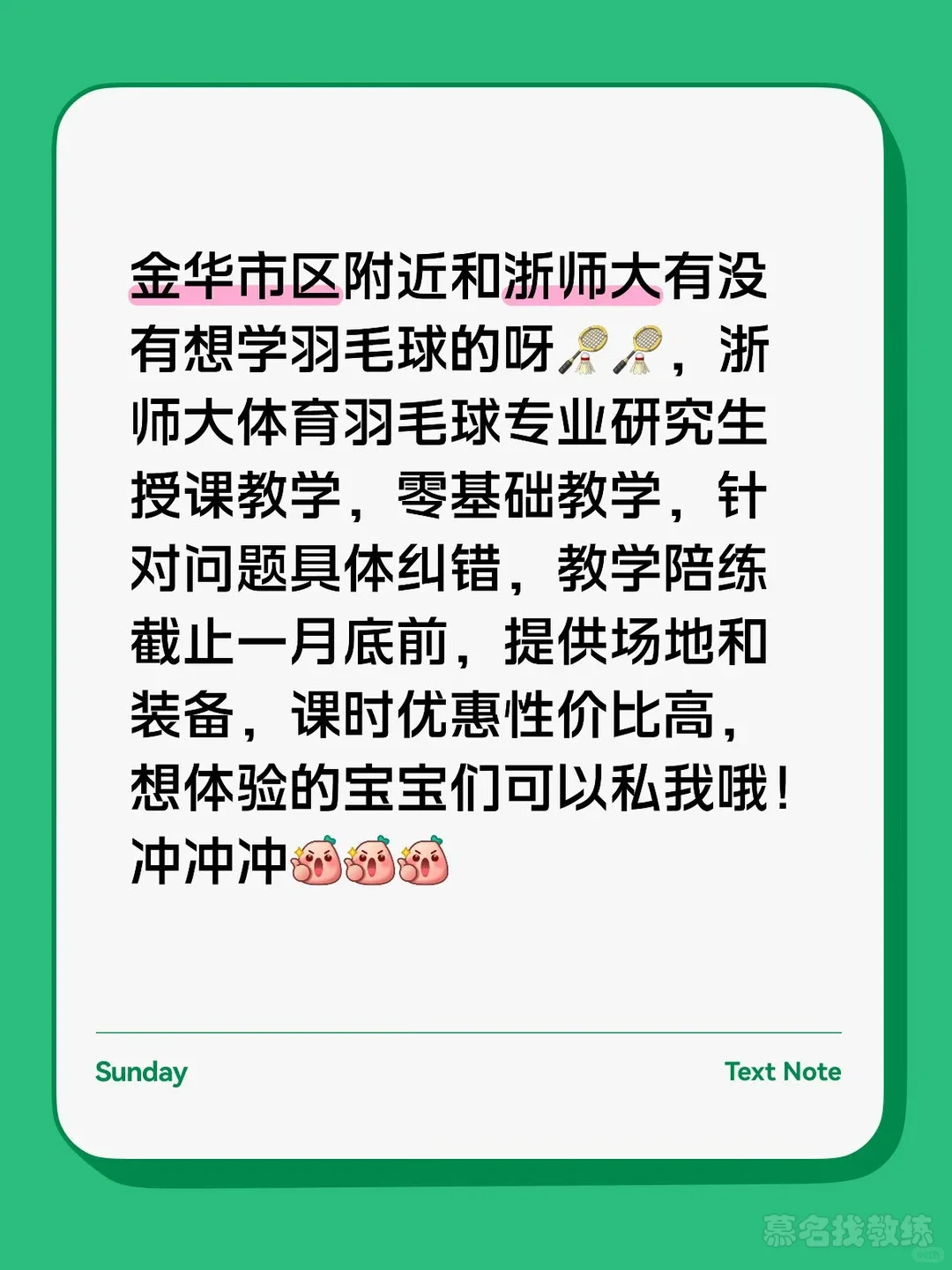 金华市区附近和浙师大的友友们,想学羽毛球的可以联系啦,浙师大体育团队教学,教学专业,可以零基础教学、进阶指导,陪练,清明假期正常授课,课时优惠性价比超高,提供场地和装备,想体验的宝宝抓紧约起来啦!!冲冲冲[派对R][派对R][派对R]