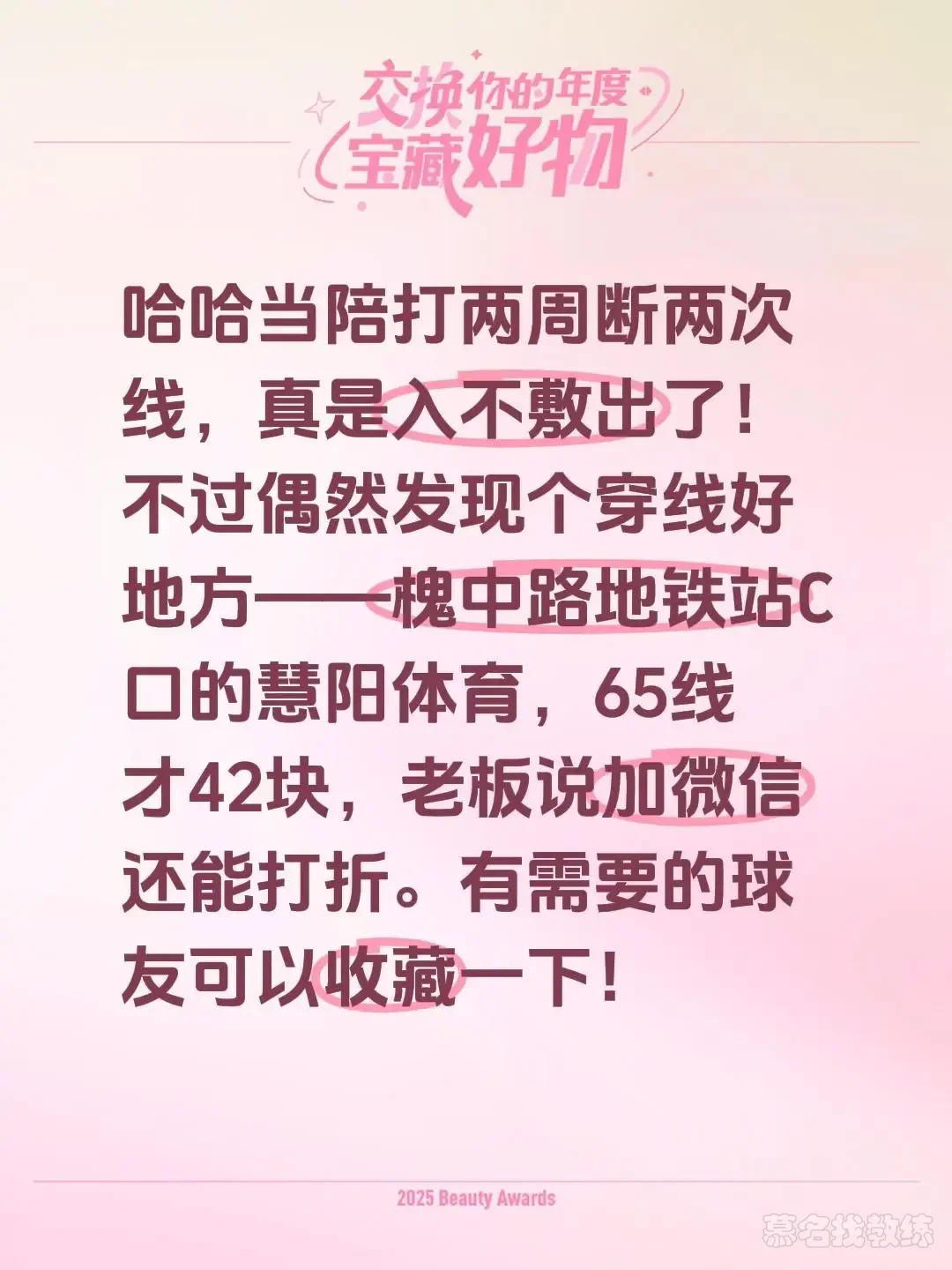 哈哈当陪打两周断两次线,真是入不敷出了!不过偶然发现个穿线好地方——槐中路地铁站C口的慧阳体育,65线才42块,老板说加微信还能打折。有需要的球友可以收藏一下!
