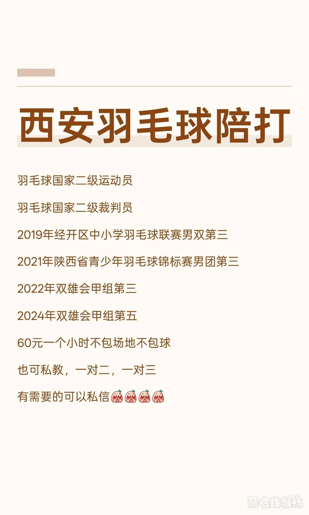 西安羽毛球教练陪练可以找我陪练60一个小时不包场地不包球如加指导价格另外私教一对一一对二一对三都可以私信我