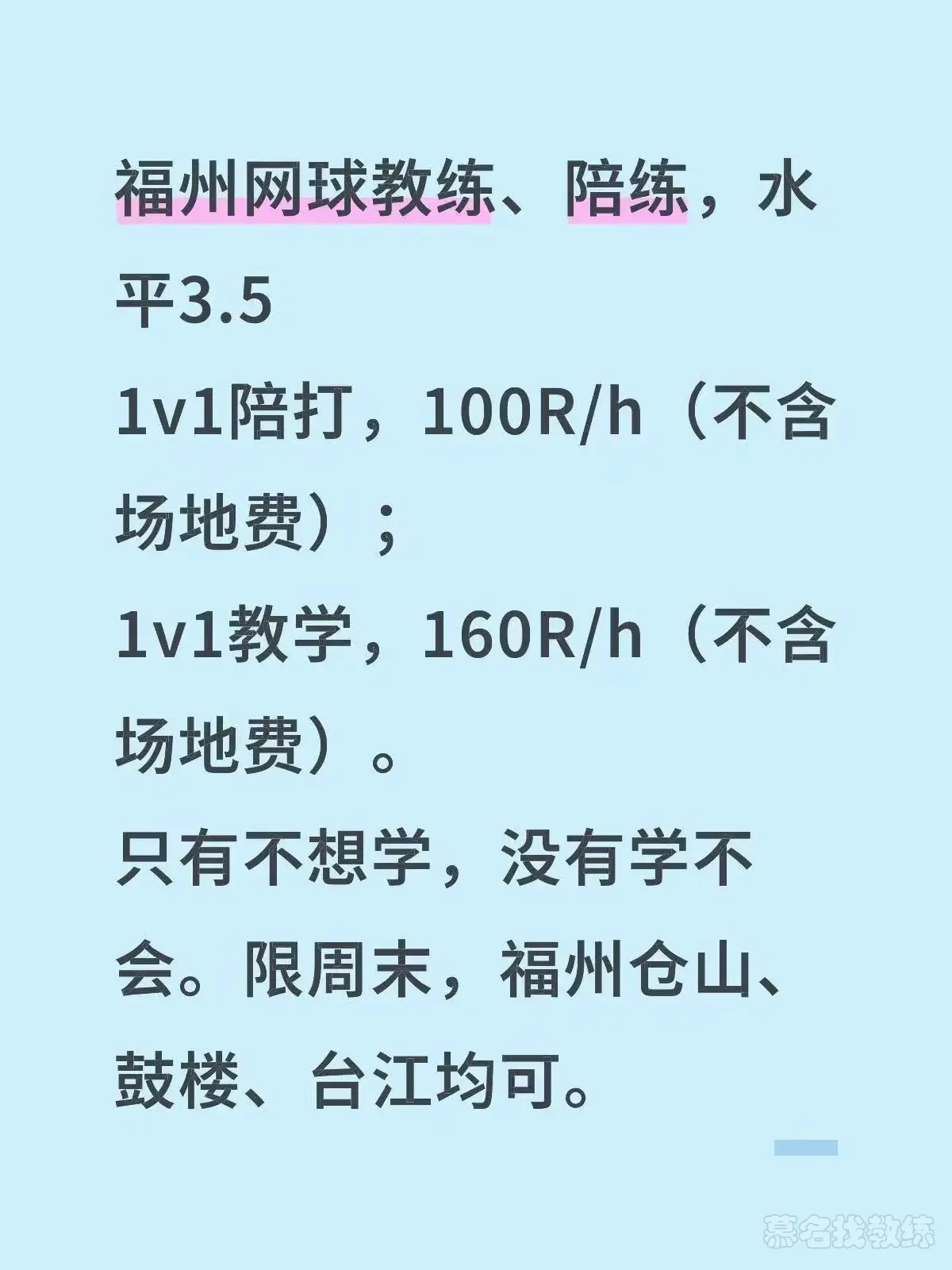 福州网球教练、陪练。多次比赛获奖,已有500余节教学\陪打经验,不满意包退,限周末。