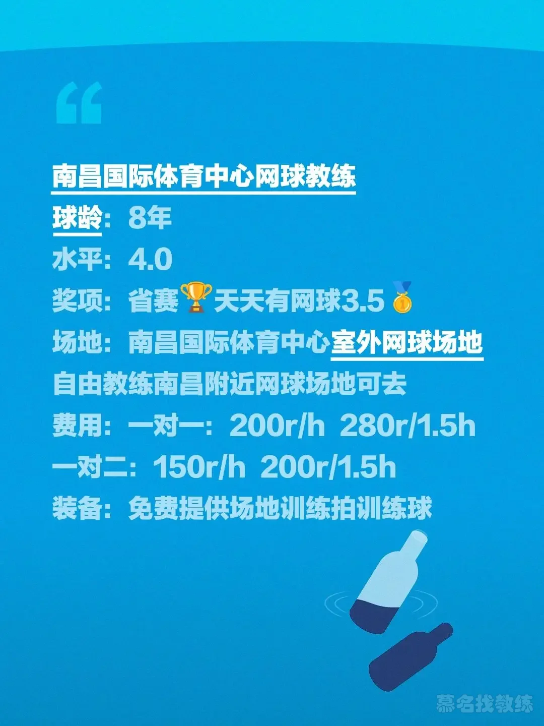 不满意,不收费。南昌国际体育中心网球教练球龄:8年水平:4.0奖项:省赛🏆天天有网球3.5场地:南昌国际体育中心室外网球场地自由教练南昌附近网球场地可去费用:一对一:200r/h 280r/1.5h一对二:150r/h 200r/1.5h装备:免费提供场地训练拍训练球