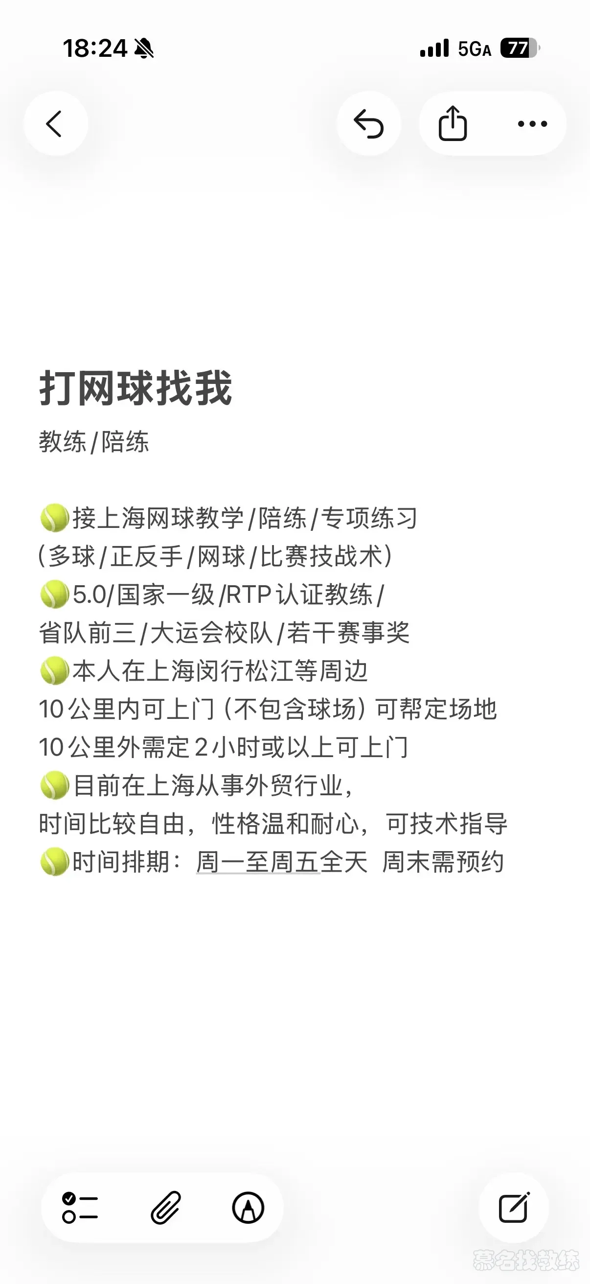 🎾接上海网球教学/陪练/专项练习(多球/正反手/比赛技战术)🎾5.0/国家一级/RTP认证教练/省队前三/大运会校队/若干赛事奖🎾本人在上海闵行松江等周边10公里内可上门(不含场地/帮定)10公里外需定2小时或以上可上门 本人性格温和耐心,可技术指导🎾时间排期:周一至周五全天周末需预约