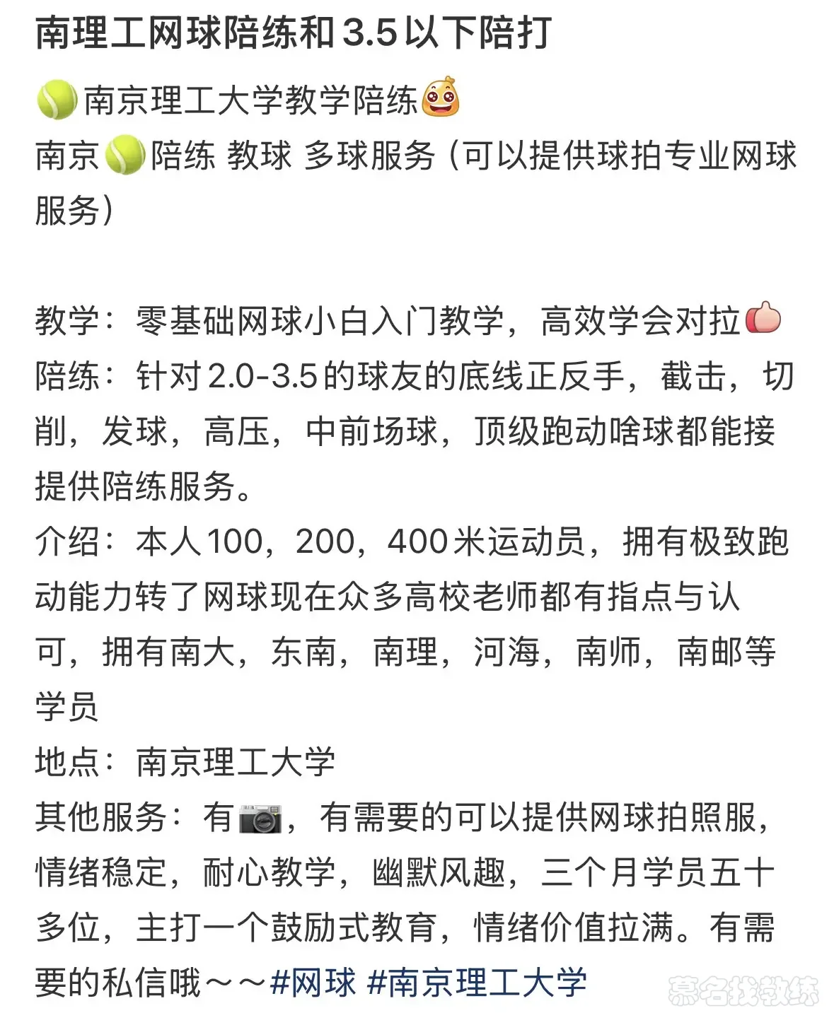 约球🎾/教学🎾/陪打🎾一二四百米运动员🏃/国家二级裁判📋半年五十多位南大 东南 南理 河海 南航 南师等学员🧑🎓常与国家裁判吹各类网球比赛🆚