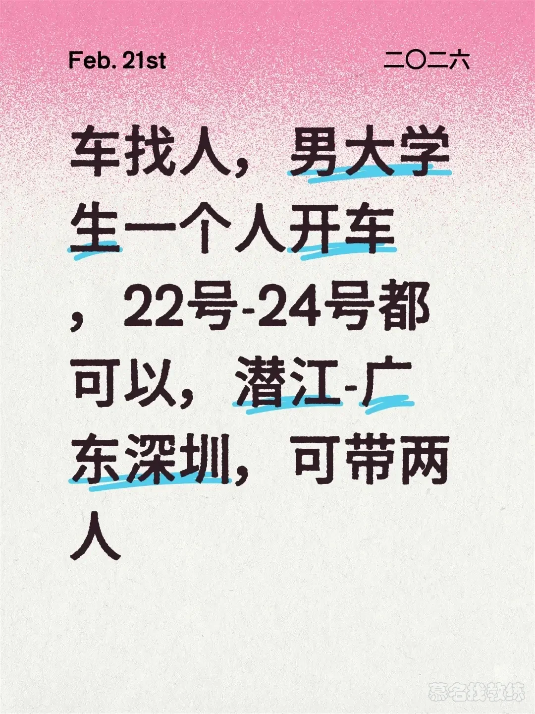 车找人,男大学生一个人开车,22号-24号都可以,潜江-广东深圳,可带两人